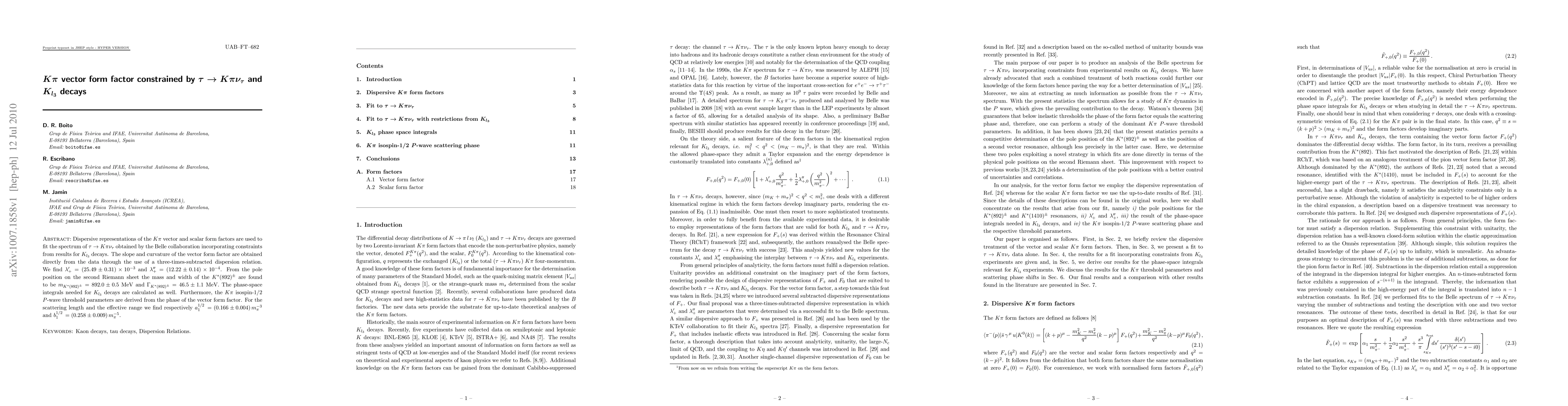Dispersive representations of the Kpi vector and scalar form factors are used to fit the spectrum of tau ---> K pi nu_tau obtained by the Belle collaboration incorporating constraints from results for K_l3 decays. The slope and curvature of the vector form factor are obtained directly from the data through the use of a three-times-subtracted dispersion relation. We find $\lambda_+'=(25.49 \pm 0.31) \times 10^{-3}$ and $\lambda_+"= (12.22 \pm 0.14) \times 10^{-4}$. From the pole position on the second Riemann sheet the mass and width of the $K^*(892)^{\pm}$ are found to be $m_{K^*(892)^\pm}=892.0\pm 0.5$~MeV and $\Gamma_{K^*(892)^\pm}=46.5\pm 1.1$~MeV. The phase-space integrals needed for K_l3 decays are calculated as well. Furthermore, the Kpi isospin-1/2 P-wave threshold parameters are derived from the phase of the vector form factor. For the scattering length and the effective range we find respectively $a_{1}^{1/2}\,= ( 0.166\pm 0.004)\,m_\pi^{-3}$ and $b_{1}^{1/2}\,=( 0.258\pm 0.009)\,m_\pi^{-5}$.