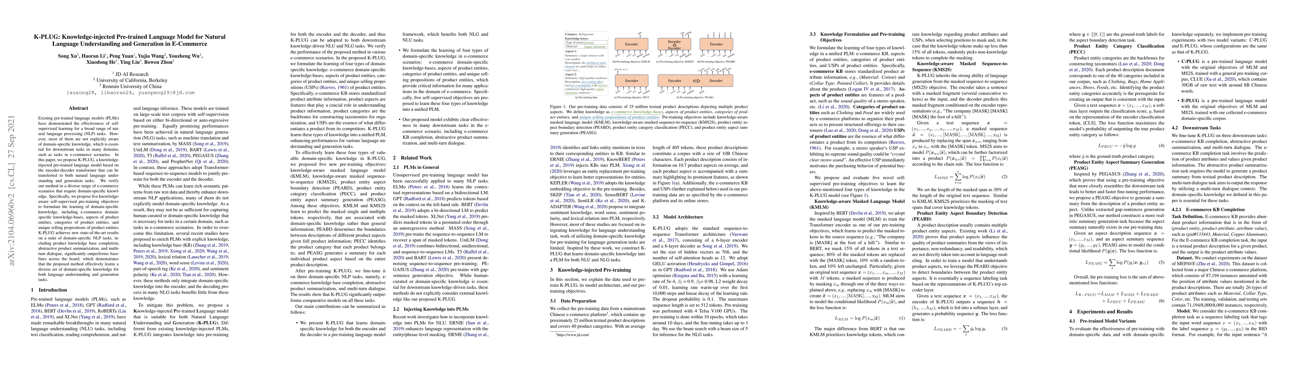 K-PLUG is a knowledge-injected pre-trained language model designed for e-commerce NLP tasks, achieving state-of-the-art results by incorporating five self-supervised pre-training objectives that learn domain-specific knowledge. It outperforms baselines in product summarization, knowledge base completion, and multi-turn dialogues.