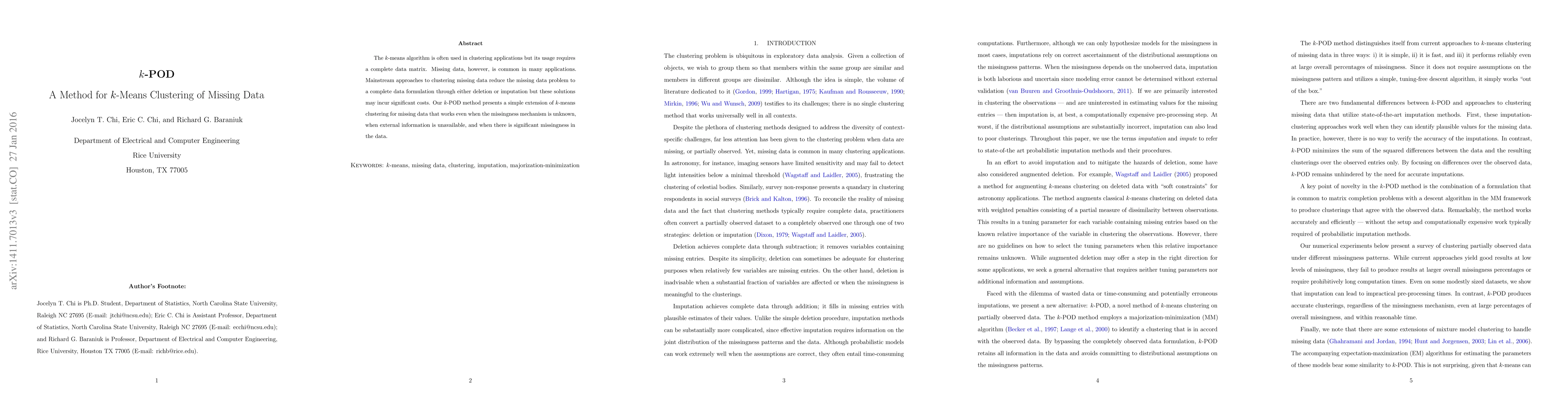 Summary: The $k$-POD method extends $k$-means clustering to handle missing data without requiring imputation or deletion, effectively managing significant missingness even when the missingness mechanism is unknown and external information is unavailable. This approach offers a cost-effective solution for clustering applications with incomplete datasets.