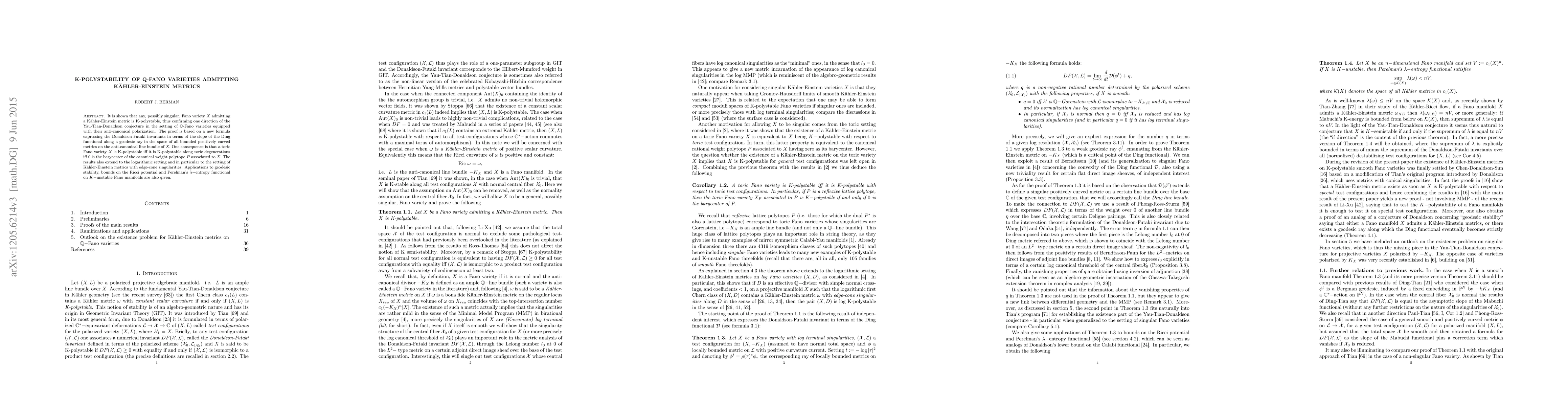 This paper confirms one direction of the Yau-Tian-Donaldson conjecture by proving that any singular Fano variety admitting a Kähler-Einstein metric is K-polystable. The proof utilizes convexity properties of the Ding functional and extends to the logarithmic setting, with applications to geodesic stability, Ricci potential bounds, and Perelman's entropy functional.