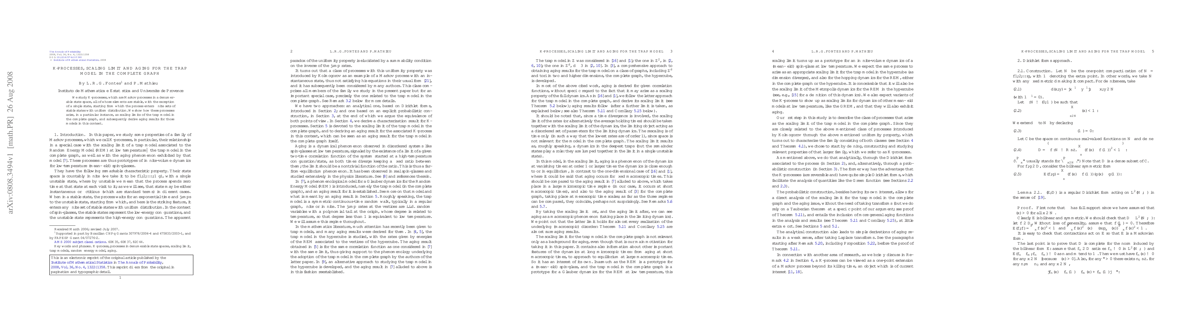 The paper investigates K-processes, stable Markov processes with one unstable state, and demonstrates their emergence as scaling limits of the trap model in a complete graph. It also derives aging results for these models.