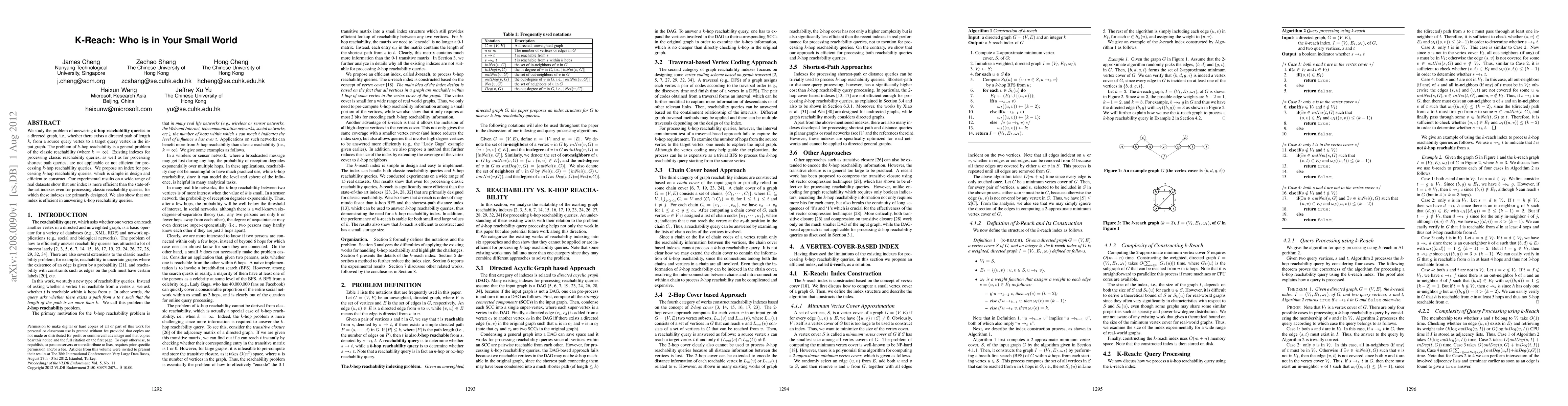 We study the problem of answering k-hop reachability queries in a directed graph, i.e., whether there exists a directed path of length k, from a source query vertex to a target query vertex in the input graph. The problem of k-hop reachability is a general problem of the classic reachability (where k=infinity). Existing indexes for processing classic reachability queries, as well as for processing shortest path queries, are not applicable or not efficient for processing k-hop reachability queries. We propose an index for processing k-hop reachability queries, which is simple in design and efficient to construct. Our experimental results on a wide range of real datasets show that our index is more efficient than the state-of-the-art indexes even for processing classic reachability queries, for which these indexes are primarily designed. We also show that our index is efficient in answering k-hop reachability queries.