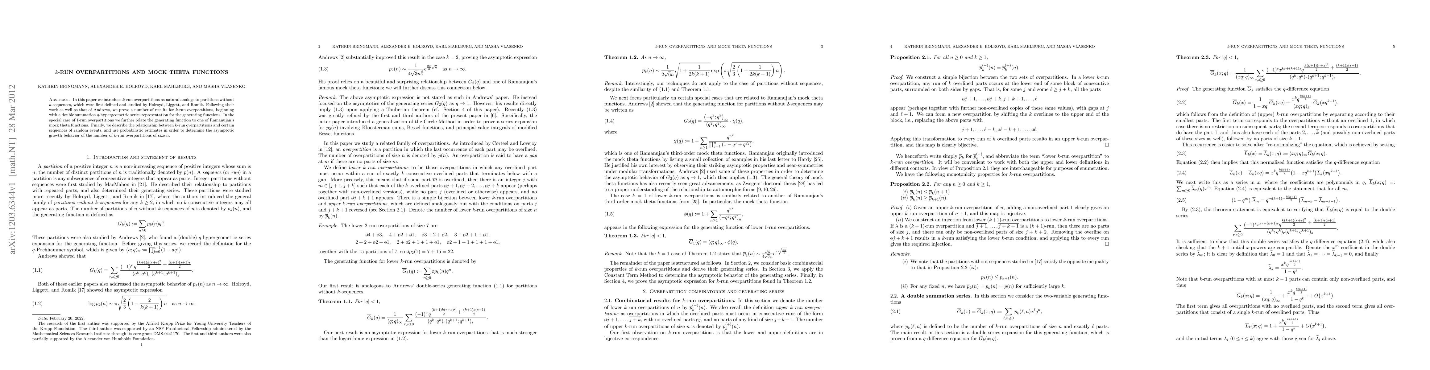This paper introduces k-run overpartitions, a generalization of partitions without k-sequences, and establishes their q-hypergeometric series representation. It also connects 1-run overpartitions to Ramanujan's mock theta functions and explores their probabilistic growth behavior.