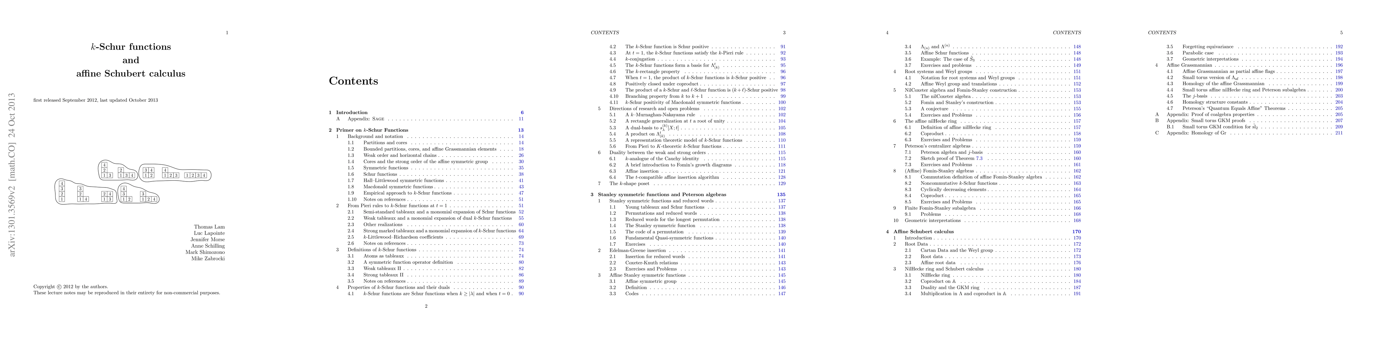 Summary: This book explores affine Schubert calculus and $k$-Schur functions, presenting three main parts: an introduction to $k$-Schur functions, an examination of Stanley symmetric functions and Peterson algebras, and a detailed study of affine Schubert calculus. Based on lectures from a 2010 workshop, it provides an in-depth view of current research in these areas.