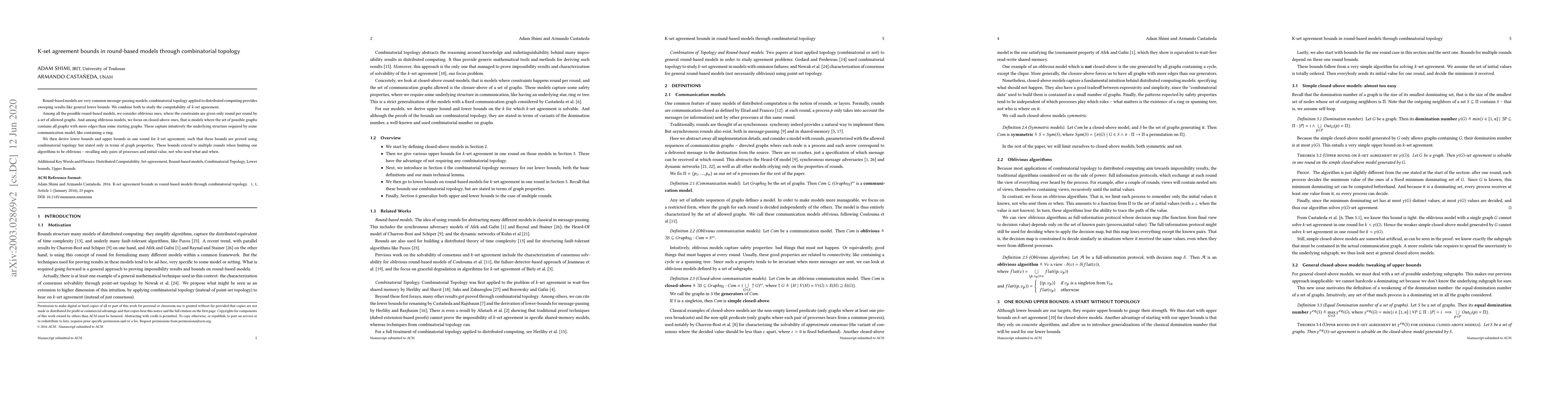 Round-based models are very common message-passing models; combinatorial topology applied to distributed computing provides sweeping results like general lower bounds. We combine both to study the computability of k-set agreement. Among all the possible round-based models, we consider oblivious ones, where the constraints are given only round per round by a set of allowed graphs. And among oblivious models, we focus on closed-above ones, that is models where the set of possible graphs contains all graphs with more edges than some starting graphs. These capture intuitively the underlying structure required by some communication model, like containing a ring. We then derive lower bounds and upper bounds in one round for k-set agreement, such that these bounds are proved using combinatorial topology but stated only in terms of graph properties. These bounds extend to multiple rounds when limiting our algorithms to be oblivious -- recalling only pairs of processes and initial value, not who send what and when.