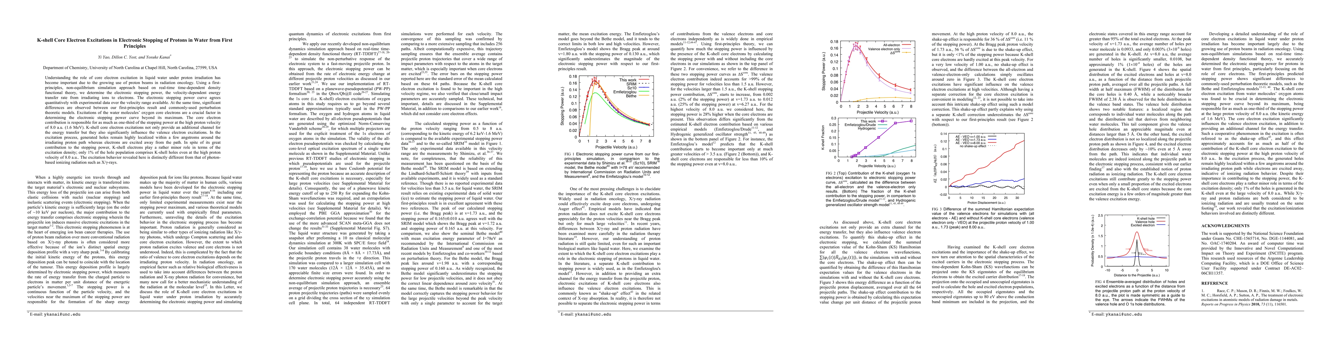 This study uses first-principles simulations to show that K-shell core electron excitations in water significantly contribute to the electronic stopping power of protons, accounting for up to one-third of the stopping power at high proton velocities, and differ markedly from the behavior observed with X/gamma-ray photon radiation.