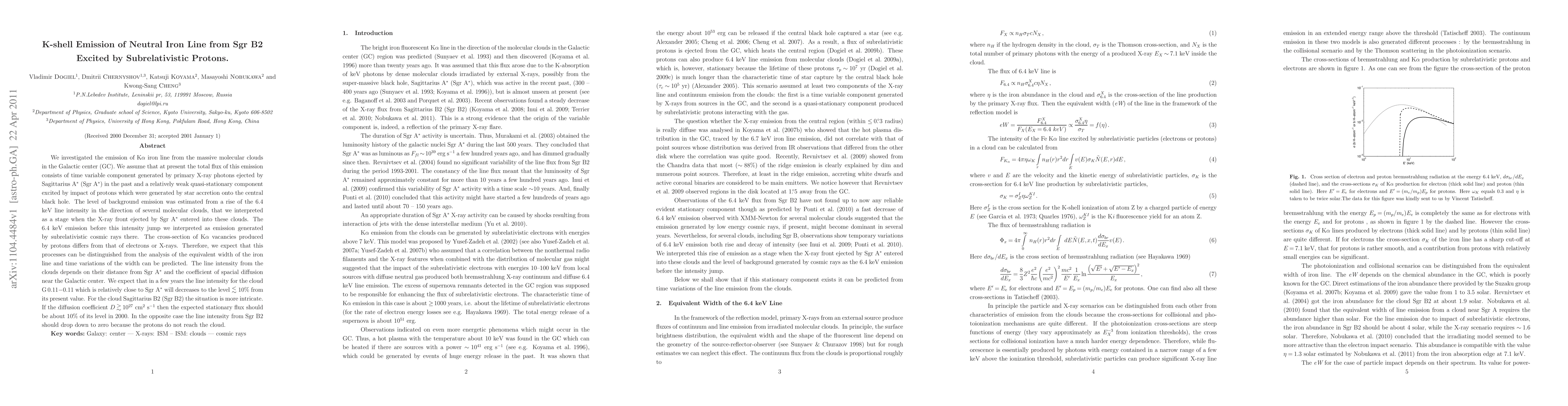 We investigated the emission of K$\alpha$ iron line from the massive molecular clouds in the Galactic center (GC). We assume that at present the total flux of this emission consists of time variable component generated by primary X-ray photons ejected by Sagittarius A$^\ast$ (Sgr A$^\ast$) in the past and a relatively weak quasi-stationary component excited by impact of protons which were generated by star accretion onto the central black hole. The level of background emission was estimated from a rise of the 6.4 keV line intensity in the direction of several molecular clouds, that we interpreted as a stage when the X-ray front ejected by Sgr A$^\ast$ entered into these clouds. The 6.4 keV emission before this intensity jump we interpreted as emission generated by subrelativistic cosmic rays there. The cross-section of K$\alpha$ vacancies produced by protons differs from that of electrons or X-rays. Therefore, we expect that this processes can be distinguished from the analysis of the equivalent width of the iron line and time variations of the width can be predicted. The line intensity from the clouds depends on their distance from Sgr A$^\ast$ and the coefficient of spacial diffusion near the Galactic center. We expect that in a few years the line intensity for the cloud G\,0.11$-$0.11 which is relatively close to Sgr A$^\ast$ will decreases to the level $\lesssim$ 10% from its present value. For the cloud Sagittarius B2 (Sgr B2) the situation is more intricate. If the diffusion coefficient $D\gtrsim 10^{27}$ cm$^2$ s$^{-1}$ then the expected stationary flux should be about 10% of its level in 2000. In the opposite case the line intensity from Sgr B2 should drop down to zero because the protons do not reach the cloud.