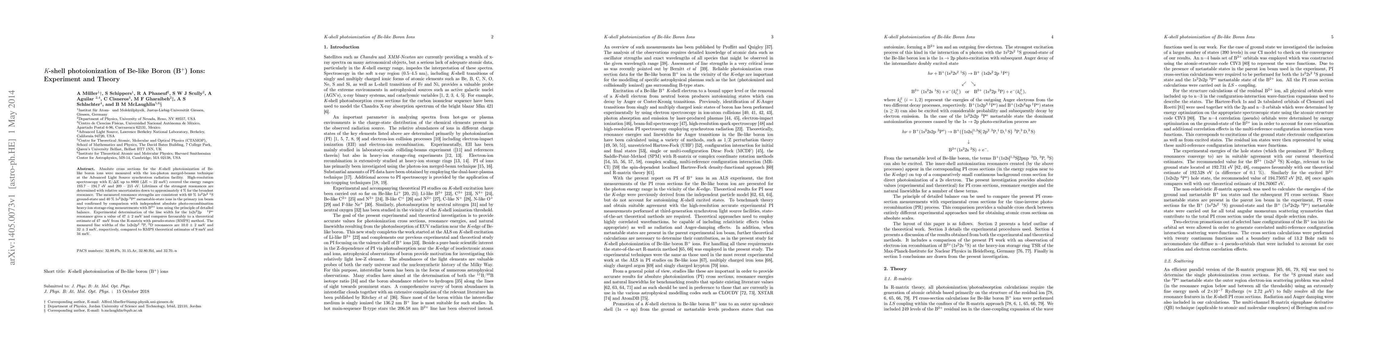 This paper reports on the K-shell photoionization of Be-like boron ions (B$^+$) using the ion-photon merged-beams technique, measuring absolute cross sections and resonance lifetimes with high precision. The results are consistent with theoretical estimates from the R-matrix with pseudo-states method.