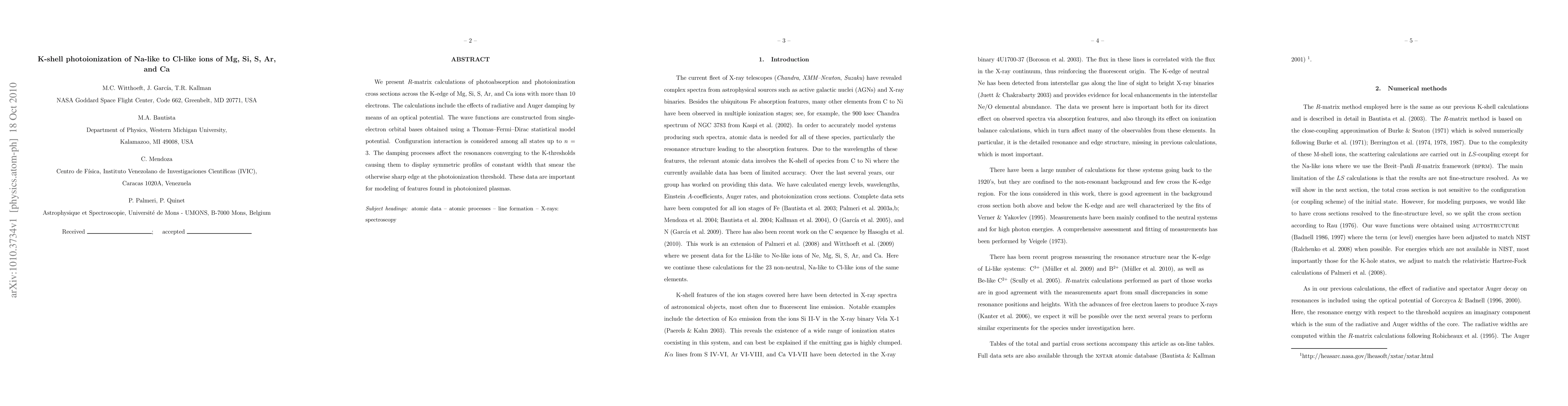 We present $R$-matrix calculations of photoabsorption and photoionization cross sections across the K-edge of Mg, Si, S, Ar, and Ca ions with more than 10 electrons. The calculations include the effects of radiative and Auger damping by means of an optical potential. The wave functions are constructed from single-electron orbital bases obtained using a Thomas--Fermi--Dirac statistical model potential. Configuration interaction is considered among all states up to $n=3$. The damping processes affect the resonances converging to the K-thresholds causing them to display symmetric profiles of constant width that smear the otherwise sharp edge at the photoionization threshold. These data are important for modeling of features found in photoionized plasmas.