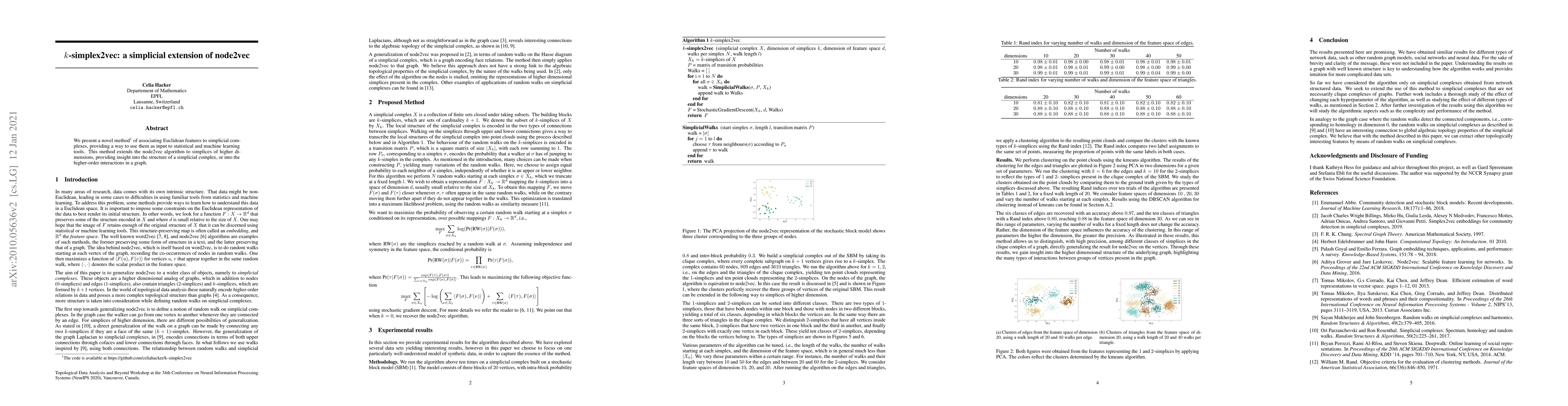 Summary: k-simplex2vec extends the node2vec algorithm to higher-dimensional simplices, enabling the association of Euclidean features to simplicial complexes for use in statistical and machine learning applications, thereby revealing higher-order interactions in graphs.