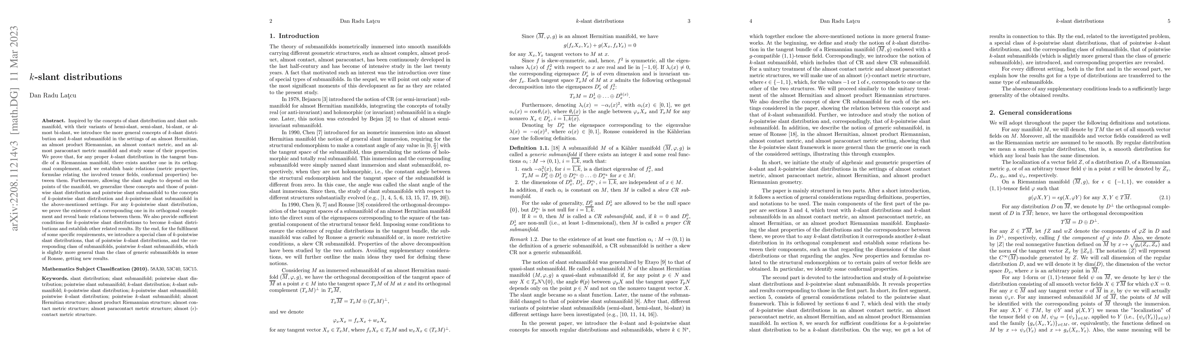 Inspired by the concepts of slant distribution and slant submanifold, with their variants of hemi-slant, semi-slant, bi-slant, or almost bi-slant, we introduce the more general concepts of $k$-slant distribution and $k$-slant submanifold in the settings of an almost Hermitian, an almost product Riemannian, an almost contact metric, and an almost paracontact metric manifold and study some of their properties. We prove that, for any proper $k$-slant distribution in the tangent bundle of a Riemannian manifold, there exists another one in its orthogonal complement, and we establish basic relations (metric properties, formulae relating the involved tensor fields, conformal properties) between them. Furthermore, allowing the slant angles to depend on the points of the manifold, we generalize these concepts and those of pointwise slant distribution and pointwise slant submanifold to the concepts of $k$-pointwise slant distribution and $k$-pointwise slant submanifold in the above-mentioned settings. For any $k$-pointwise slant distribution, we prove the existence of a corresponding one in its orthogonal complement and reveal basic relations between them. We also provide sufficient conditions for $k$-pointwise slant distributions to become $k$-slant distributions and establish other related results. By the end, for the fulfilment of some specific requirements, we introduce a special class of $k$-pointwise slant distributions, that of pointwise $k$-slant distributions, and the corresponding class of submanifolds, pointwise $k$-slant submanifolds, which is slightly more general than the class of generic submanifolds in sense of Ronsse, getting new results.
