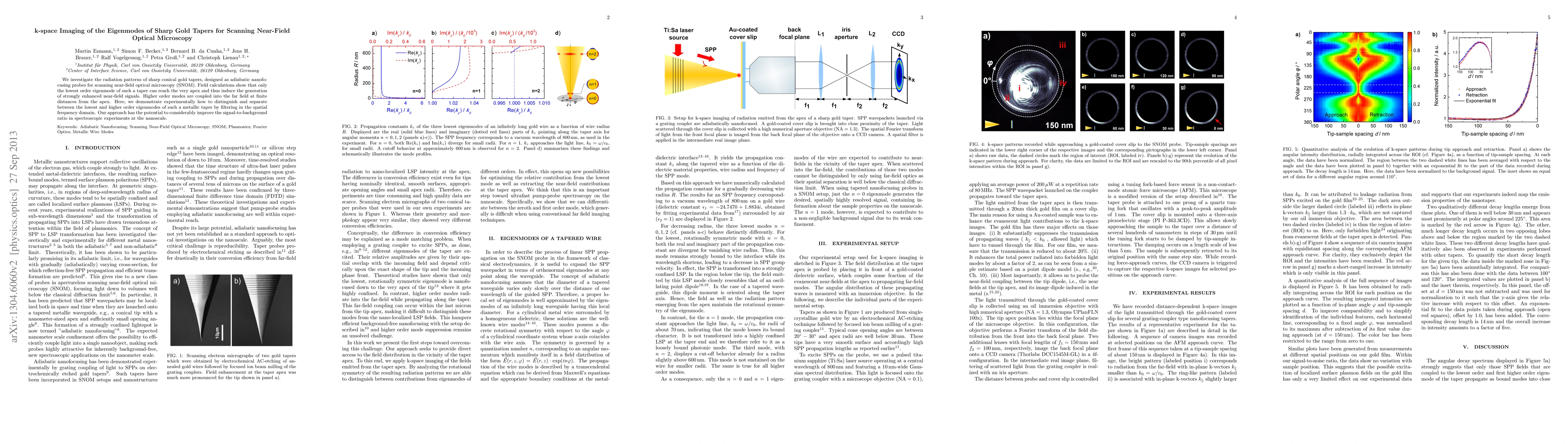 This paper investigates the radiation patterns of sharp gold tapers used in scanning near-field optical microscopy (SNOM), demonstrating that only the lowest order eigenmode can reach the apex for enhanced near-field signals. The study experimentally distinguishes between eigenmodes using k-space imaging, potentially improving signal-to-background ratios in nanoscale spectroscopic experiments.
