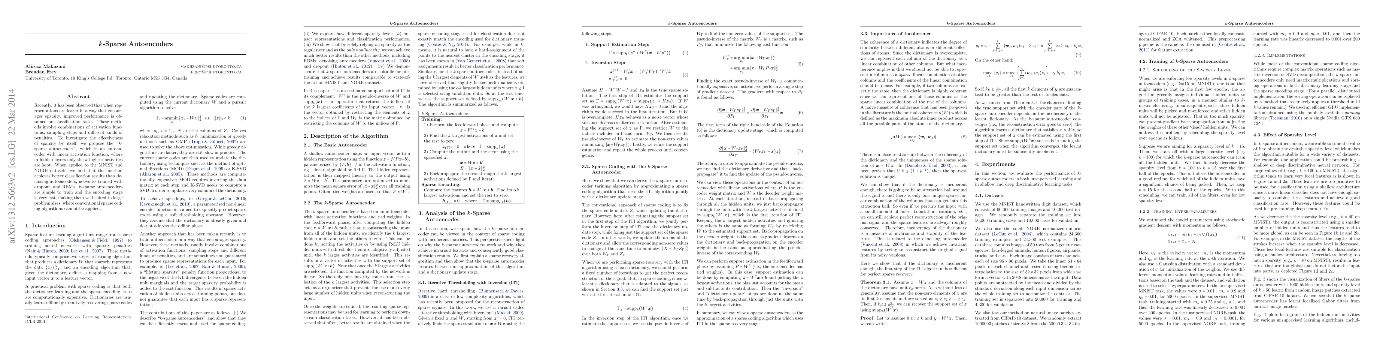 The k-sparse autoencoder, which retains only the k highest activities in hidden layers, demonstrates superior classification performance on MNIST and NORB datasets compared to denoising autoencoders, dropout networks, and RBMs, while also being simple to train and fast for large-scale problems.