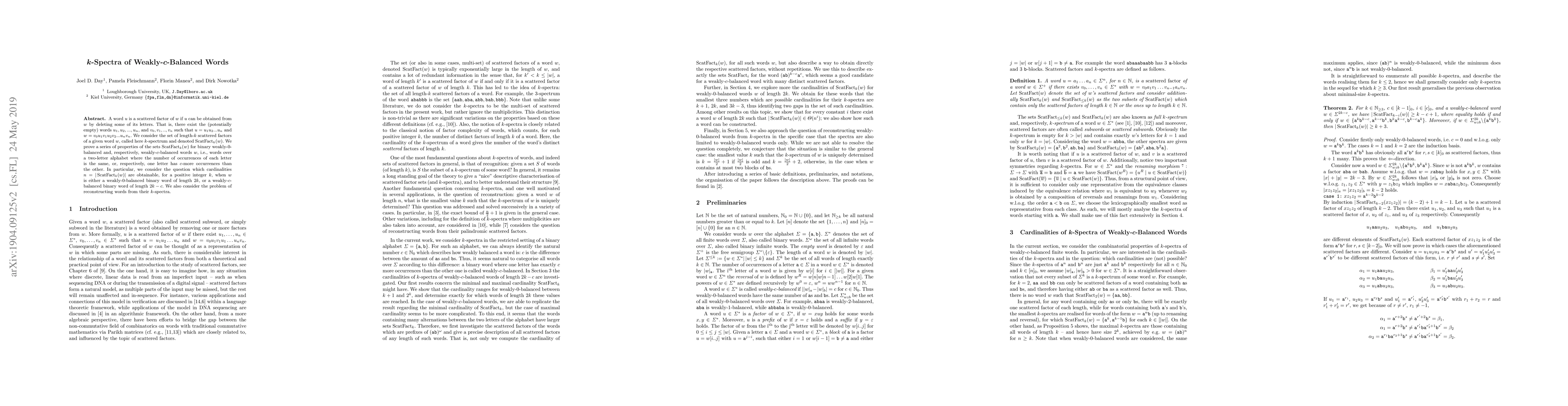 A word $u$ is a scattered factor of $w$ if $u$ can be obtained from $w$ by deleting some of its letters. That is, there exist the (potentially empty) words $u_1,u_2,..., u_n$, and $v_0,v_1,..,v_n$ such that $u = u_1u_2...u_n$ and $w = v_0u_1v_1u_2v_2...u_nv_n$. We consider the set of length-$k$ scattered factors of a given word w, called here $k$-spectrum and denoted $\ScatFact_k(w)$. We prove a series of properties of the sets $\ScatFact_k(w)$ for binary strictly balanced and, respectively, $c$-balanced words $w$, i.e., words over a two-letter alphabet where the number of occurrences of each letter is the same, or, respectively, one letter has $c$-more occurrences than the other. In particular, we consider the question which cardinalities $n= |\ScatFact_k(w)|$ are obtainable, for a positive integer $k$, when $w$ is either a strictly balanced binary word of length $2k$, or a $c$-balanced binary word of length $2k-c$. We also consider the problem of reconstructing words from their $k$-spectra.