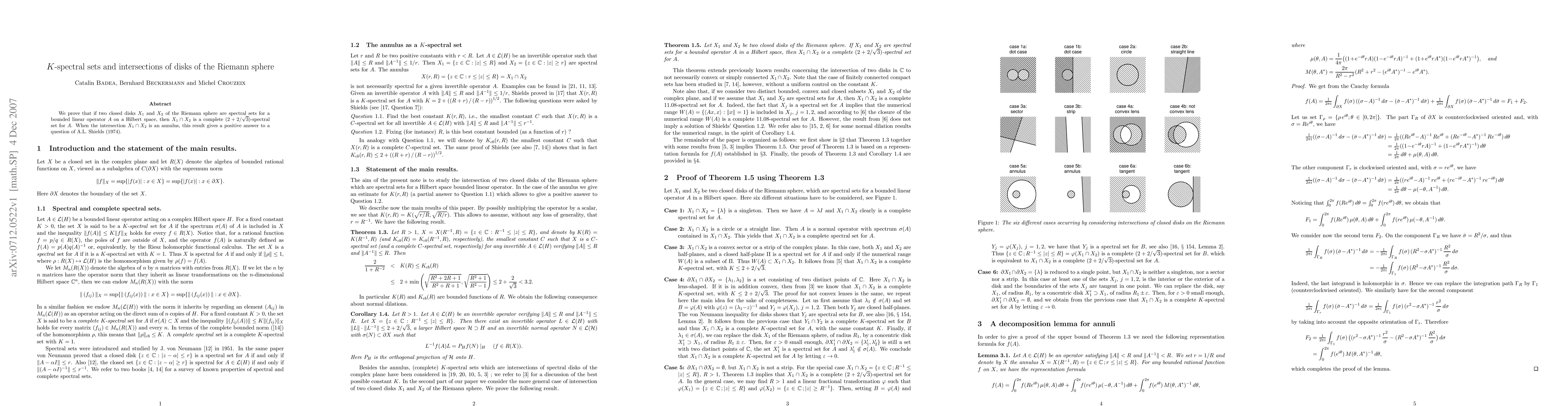 We prove that if two closed disks X_1 and X_2 of the Riemann sphere are spectral sets for a bounded linear operator A on a Hilbert space, then the intersection X_1\cap X_2 is a complete (2+2/\sqrt{3})-spectral set for A. When the intersection of X_1 and X_2 is an annulus, this result gives a positive answer to a question of A.L. Shields (1974).