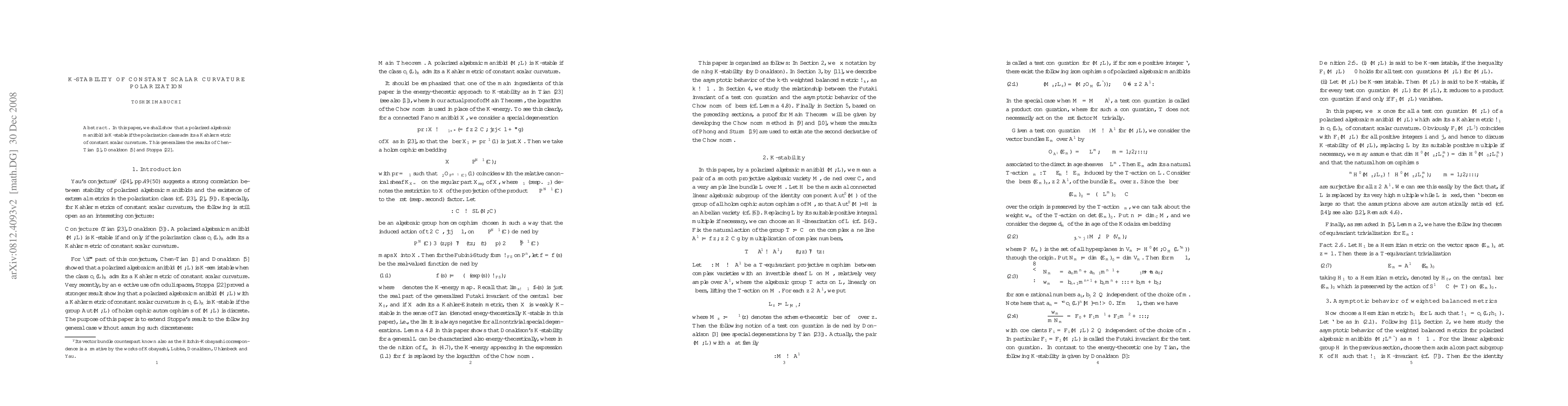 A polarized manifold is K-stable if it has a Kaehler metric of constant scalar curvature, generalizing previous results on polarization class.