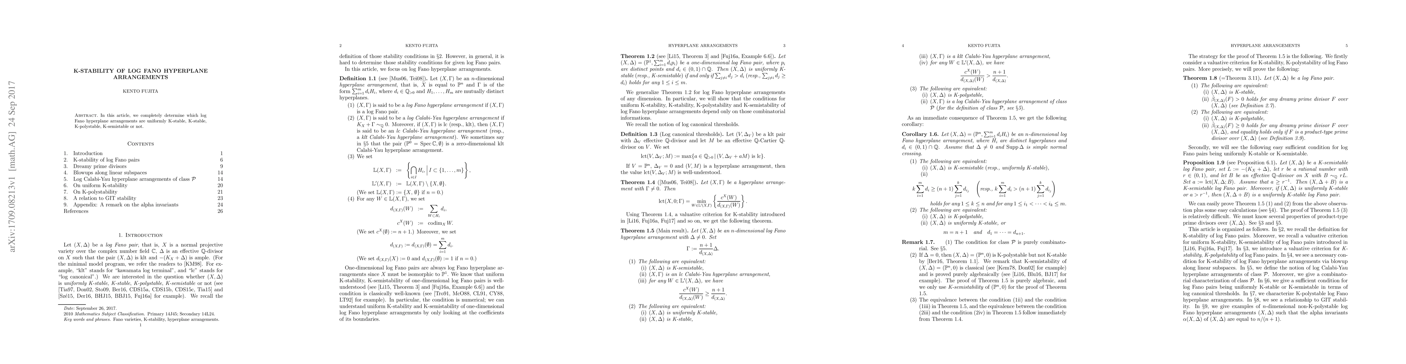 In this article, we completely determine which log Fano hyperplane arrangements are uniformly K-stable, K-stable, K-polystable, K-semistable or not.