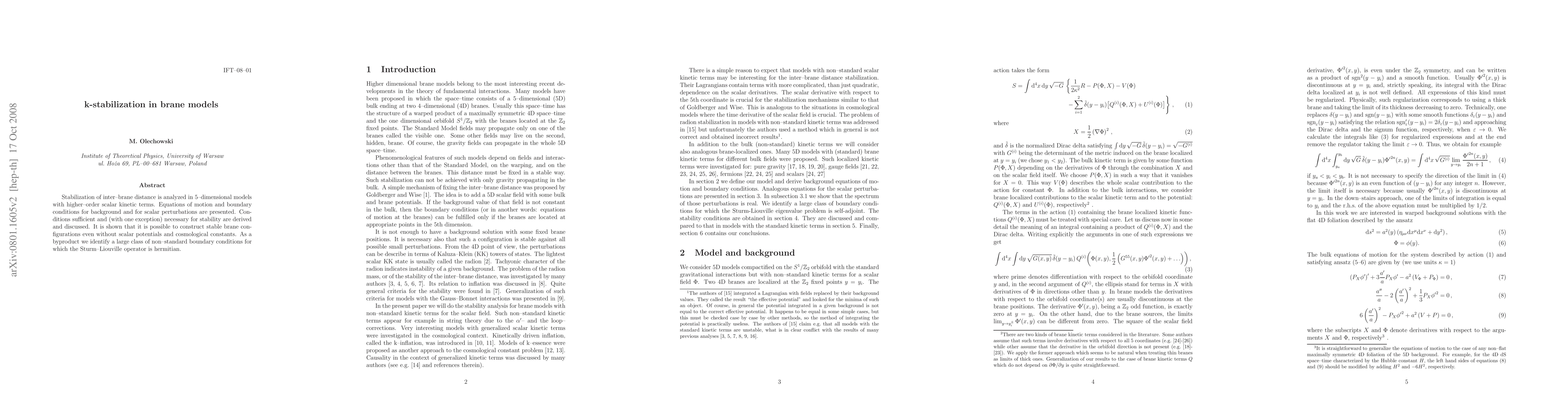 The paper investigates brane model stability focusing on 5D models with higher-order scalar kinetic terms. It presents conditions for brane distance stabilization without scalar potentials or cosmological constants, identifying a class of non-standard boundary conditions making the Sturm-Liouville operator hermitian.