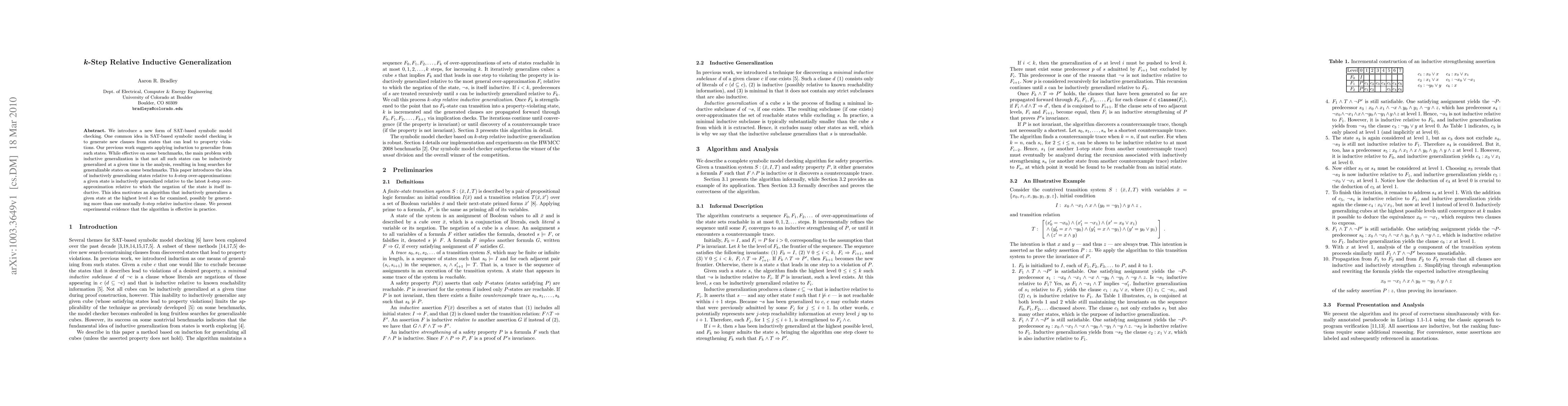 This paper introduces a new SAT-based model checking method that uses k-step relative inductive generalization to improve the efficiency of property verification. It presents experimental evidence showing its effectiveness in practice.