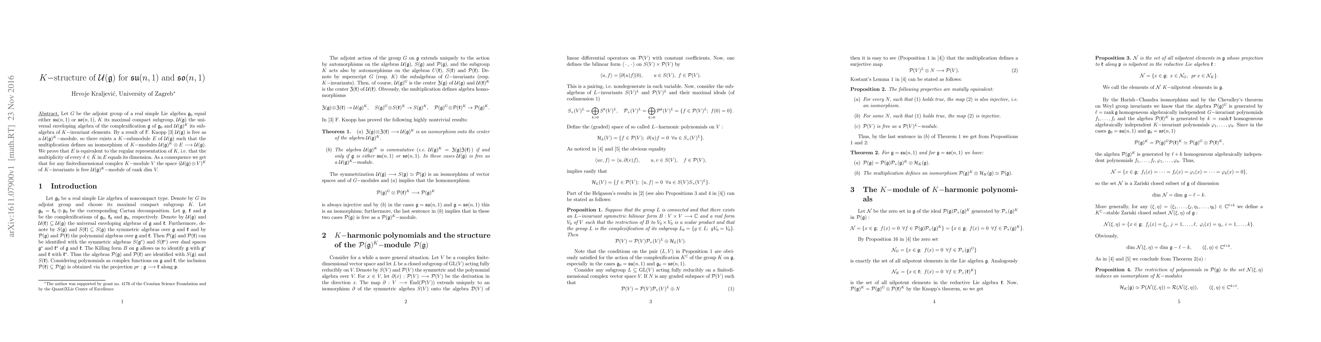 The paper establishes a detailed $K$-structure of the universal enveloping algebra ${\cal U}(\mathfrak{g})$ for $\mathfrak{s}\mathfrak{u}(n,1)$ and $\mathfrak{s}\mathfrak{o}(n,1)$, proving key properties of $K$-invariant elements and their relation to the regular representation of $K$.