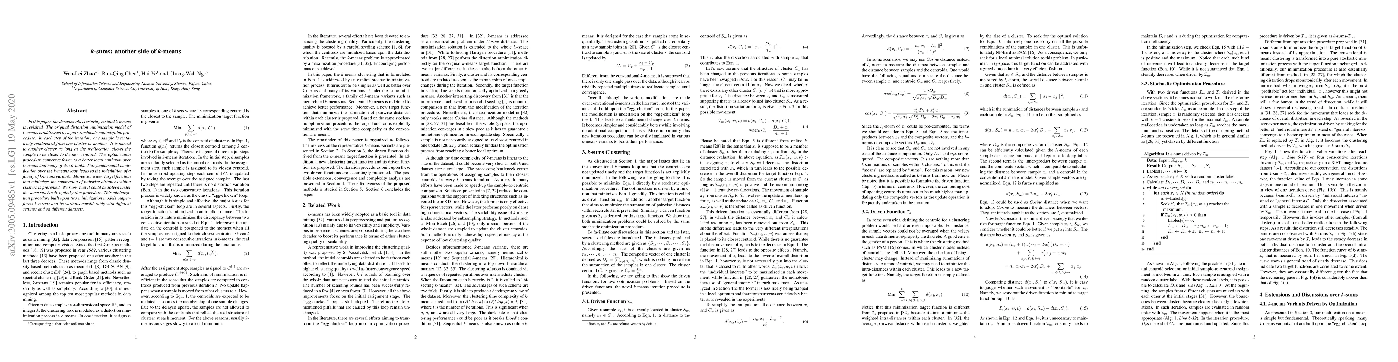 In this paper, the decades-old clustering method k-means is revisited. The original distortion minimization model of k-means is addressed by a pure stochastic minimization procedure. In each step of the iteration, one sample is tentatively reallocated from one cluster to another. It is moved to another cluster as long as the reallocation allows the sample to be closer to the new centroid. This optimization procedure converges faster to a better local minimum over k-means and many of its variants. This fundamental modification over the k-means loop leads to the redefinition of a family of k-means variants. Moreover, a new target function that minimizes the summation of pairwise distances within clusters is presented. We show that it could be solved under the same stochastic optimization procedure. This minimization procedure built upon two minimization models outperforms k-means and its variants considerably with different settings and on different datasets.