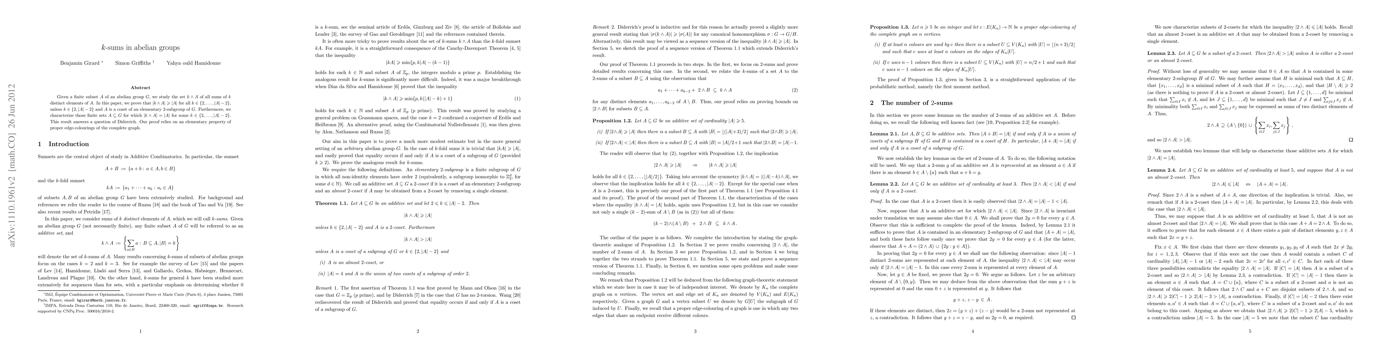 This paper investigates the sums of k distinct elements in a finite subset A of an abelian group G, proving that |k ∧ A| ≥ |A| for k in {2,...,|A|-2}, except when k is 2 or |A|-2 and A is a coset of an elementary 2-subgroup. The authors also characterize subsets A where |k ∧ A| = |A| for some k, answering a question posed by Diderrich.