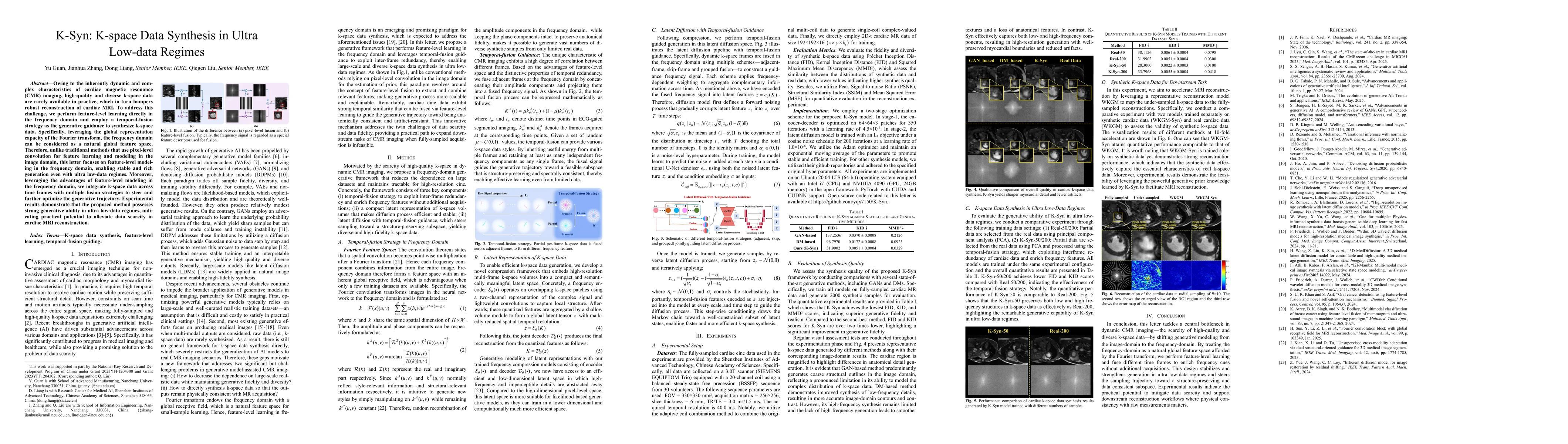Owing to the inherently dynamic and complex characteristics of cardiac magnetic resonance (CMR) imaging, high-quality and diverse k-space data are rarely available in practice, which in turn hampers robust reconstruction of dynamic cardiac MRI. To address this challenge, we perform feature-level learning directly in the frequency domain and employ a temporal-fusion strategy as the generative guidance to synthesize k-space data. Specifically, leveraging the global representation capacity of the Fourier transform, the frequency domain can be considered a natural global feature space. Therefore, unlike traditional methods that use pixel-level convolution for feature learning and modeling in the image domain, this letter focuses on feature-level modeling in the frequency domain, enabling stable and rich generation even with ultra low-data regimes. Moreover, leveraging the advantages of feature-level modeling in the frequency domain, we integrate k-space data across time frames with multiple fusion strategies to steer and further optimize the generative trajectory. Experimental results demonstrate that the proposed method possesses strong generative ability in low-data regimes, indicating practical potential to alleviate data scarcity in dynamic MRI reconstruction.