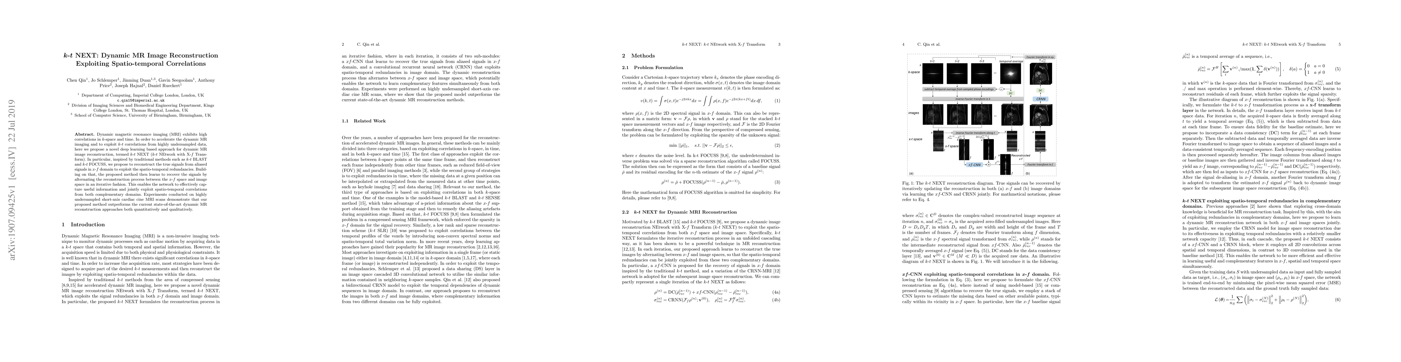 The paper proposes k-t NEXT, a deep learning-based method for dynamic MR image reconstruction that leverages spatio-temporal correlations in k-space and time from undersampled data. The method alternates between x-f and image spaces to exploit redundancies, outperforming existing techniques in reconstructing cardiac cine MRI scans.