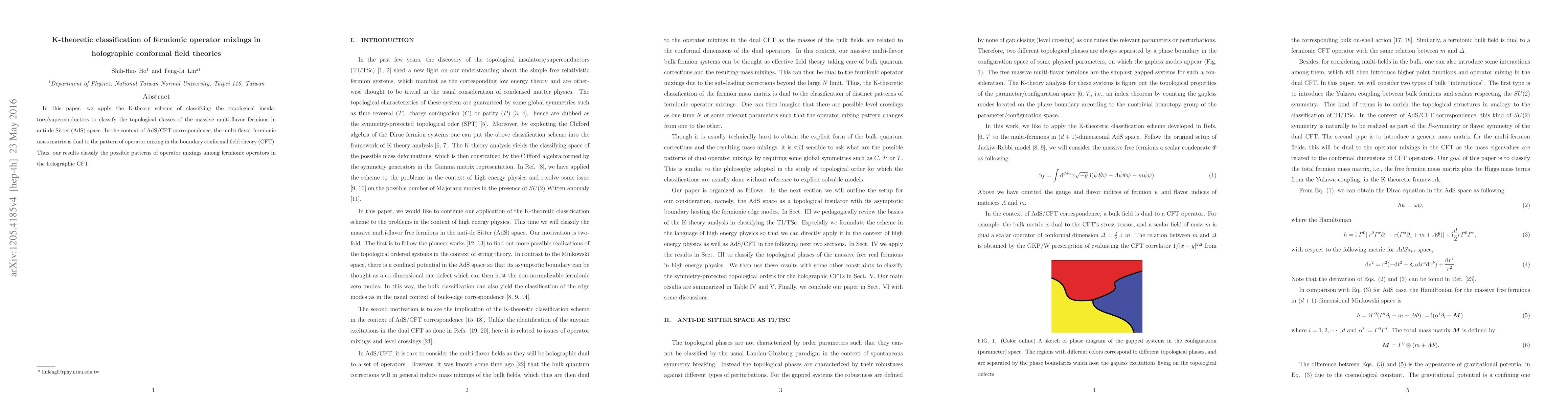 In this paper, we apply the K-theory scheme of classifying the topological insulators/superconductors to classify the topological classes of the massive multi-flavor fermions in anti-de Sitter (AdS) space. In the context of AdS/CFT correspondence, the multi-flavor fermionic mass matrix is dual to the pattern of operator mixing in the boundary conformal field theory (CFT). Thus, our results classify the possible patterns of operator mixings among fermionic operators in the holographic CFT.
