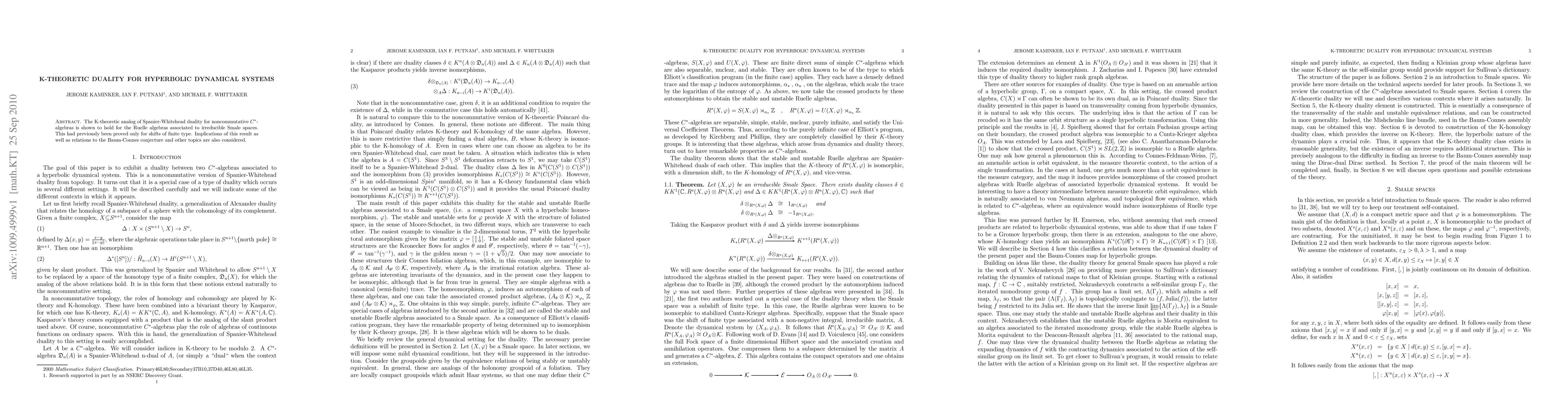 The K-theoretic analog of Spanier-Whitehead duality for noncommutative C*-algebras is shown to hold for the Ruelle algebras associated to irreducible Smale spaces. This had previously been proved only for shifts of finite type. Implications of this result as well as relations to the Baum-Connes conjecture and other topics are also considered.