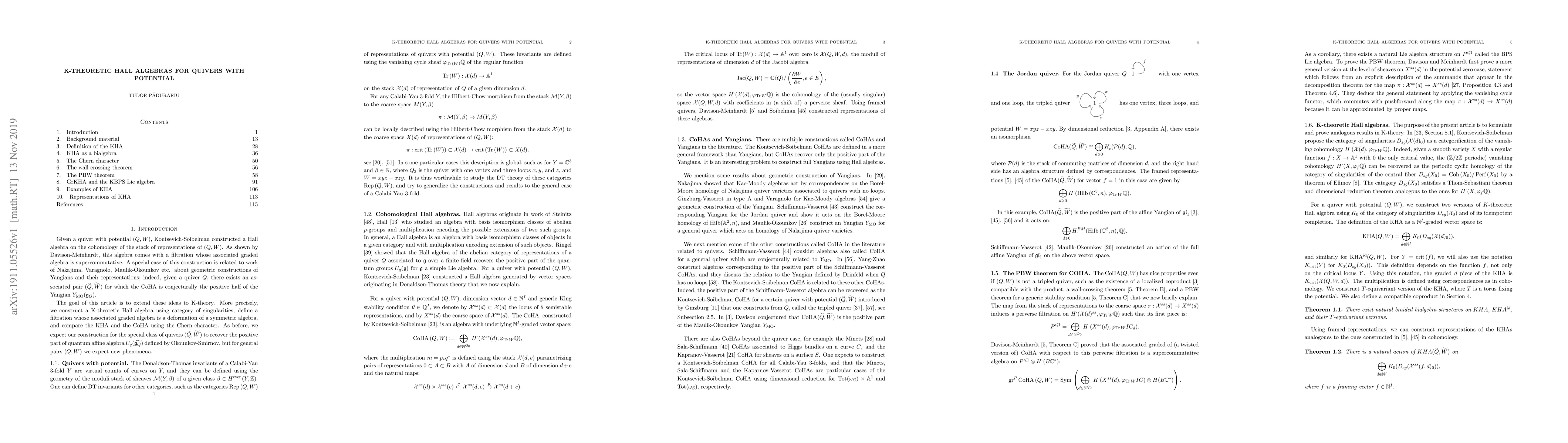 This paper introduces a K-theoretic Hall algebra for quivers with potential, extending previous work by Kontsevich-Soibelman, Davison-Meinhardt, and others. The construction involves a filtration with an associated graded algebra deforming a symmetric algebra, and a comparison between the K-theoretic Hall algebra (KHA) and Cohomology Hall algebra (CoHA) via the Chern character. The authors anticipate that for a specific class of quivers, their KHA will align with the positive part of the quantum affine algebra, while general pairs may reveal new phenomena.