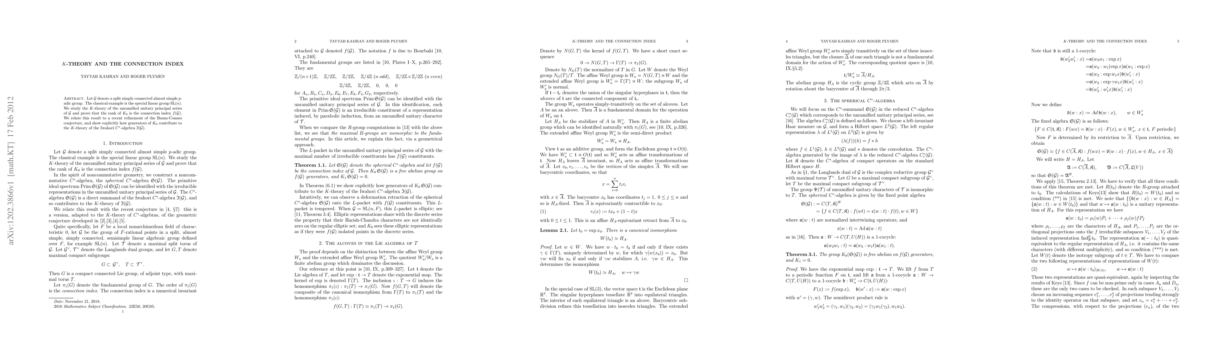 This paper examines the K-theory of unramified unitary principal series for split simple p-adic groups like SL(n), proving its rank equals the connection index f(G). It links this to a Baum-Connes conjecture refinement, demonstrating how K_0 generators influence the Iwahori C*-algebra I(G) K-theory.