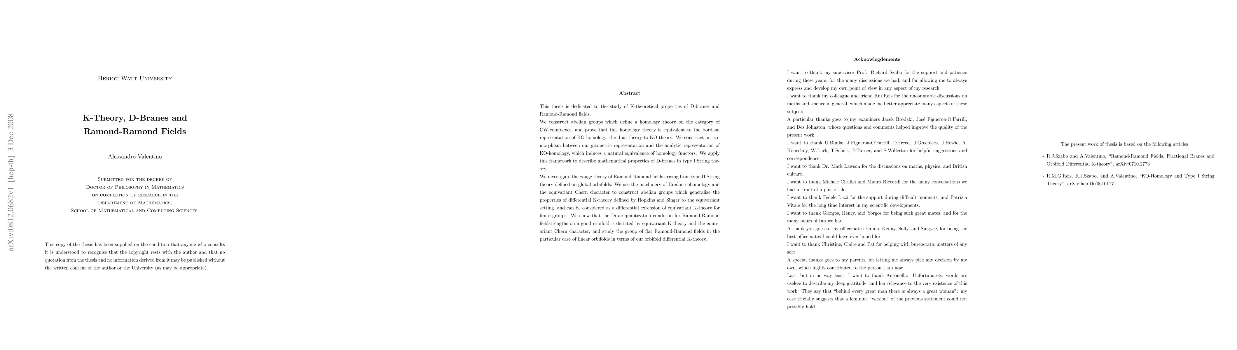 This research constructs a homology theory equivalent to KO-homology, applying it to D-branes in type I String theory and exploring the gauge theory of Ramond-Ramond fields in type II String theory. It uses Bredon cohomology and the equivariant Chern character to generalize differential K-theory for finite groups and links the Dirac quantization condition to equivariant K-theory.