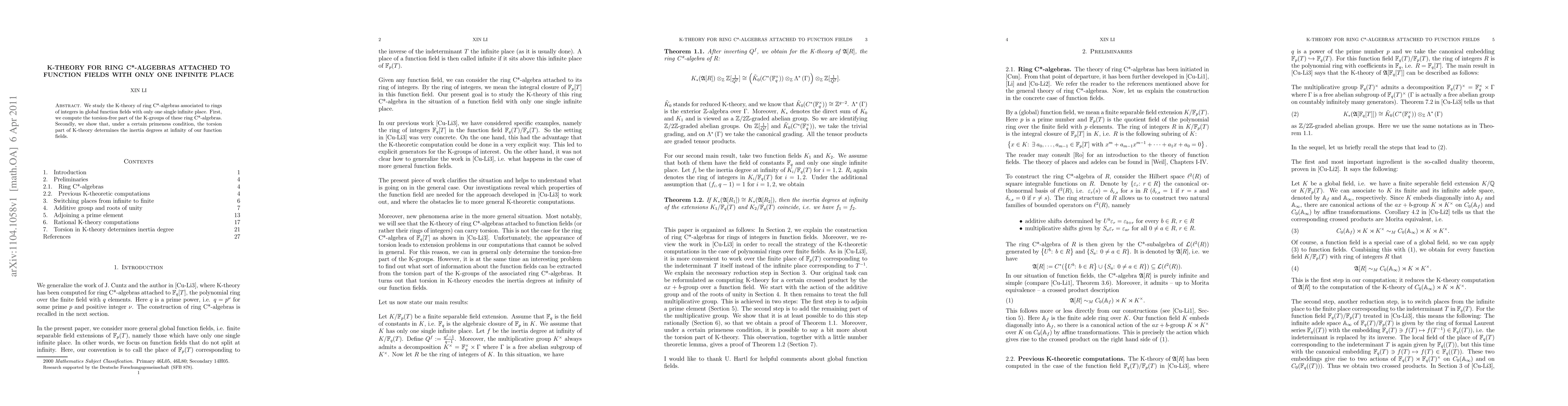 This paper studies the K-theory of ring C*-algebras associated with function fields in one infinite place, focusing on computing their torsion-free part and its relation to inertia degrees.