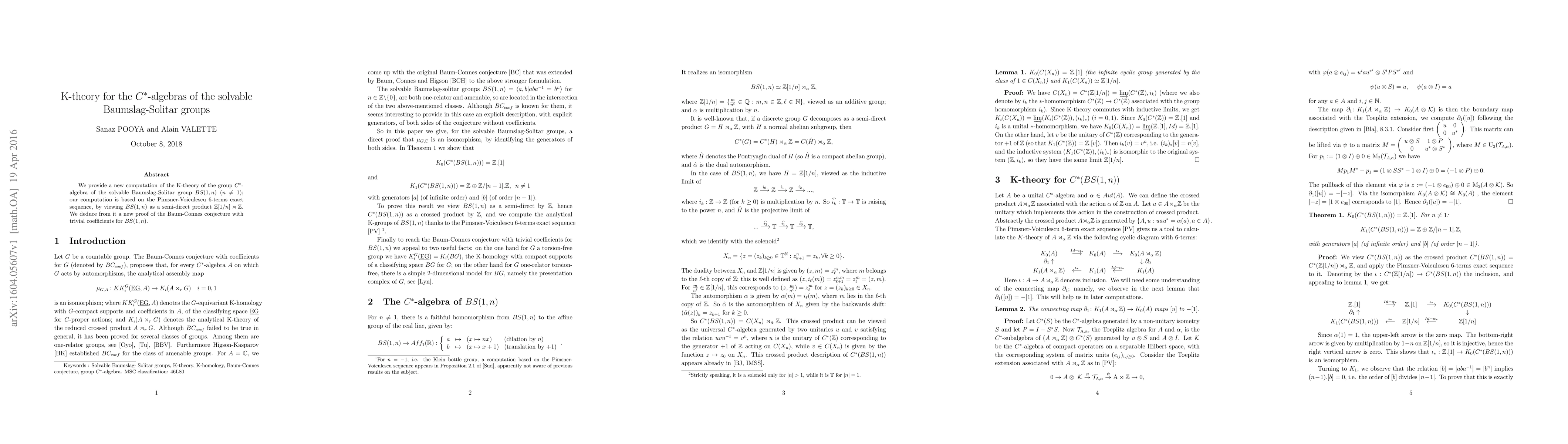 We provide a new computation of the K-theory of the group $C^*$-algebra of the solvable Baumslag-Solitar group $BS(1,n)\;(n\neq 1)$; our computation is based on the Pimsner-Voiculescu 6-terms exact sequence, by viewing $BS(1,n)$ as a semi-direct product $\mathbb{Z}[1/n]\rtimes\mathbb{Z}$. We deduce from it a new proof of the Baum-Connes conjecture with trivial coefficients for $BS(1,n)$.