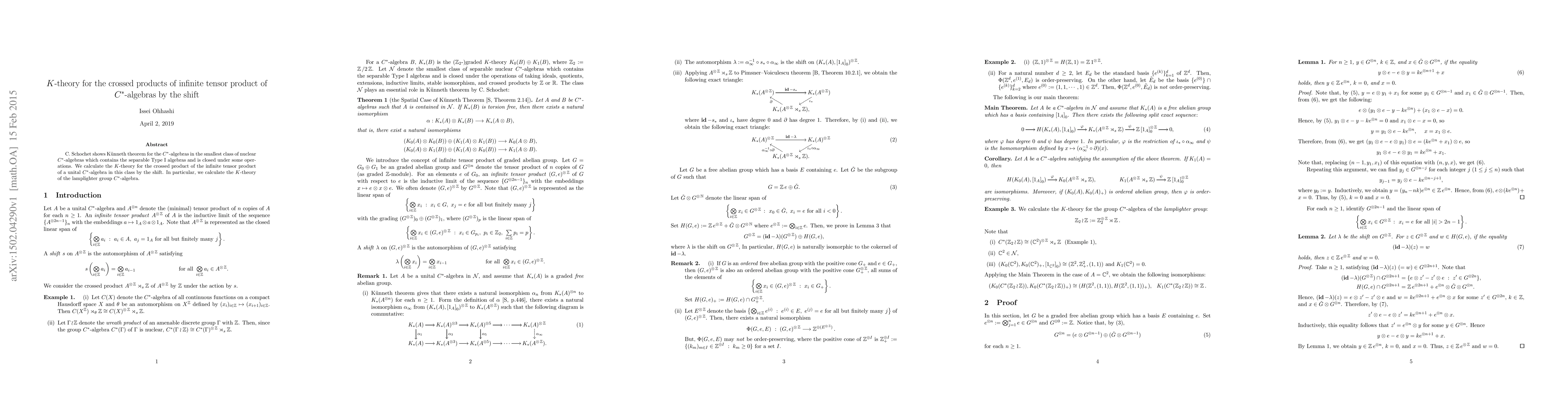 C. Schochet shows K\"unneth theorem for the $C^*$-algebras in the smallest class of nuclear $C^*$-algebras which contains the separable Type I algebras and is closed under some operations. We calculate the $K$-theory for the crossed product of the infinite tensor product of a unital $C^*$-algebra in this class by the shift. In particular, we calculate the $K$-theory of the lamplighter group $C^*$-algebra.