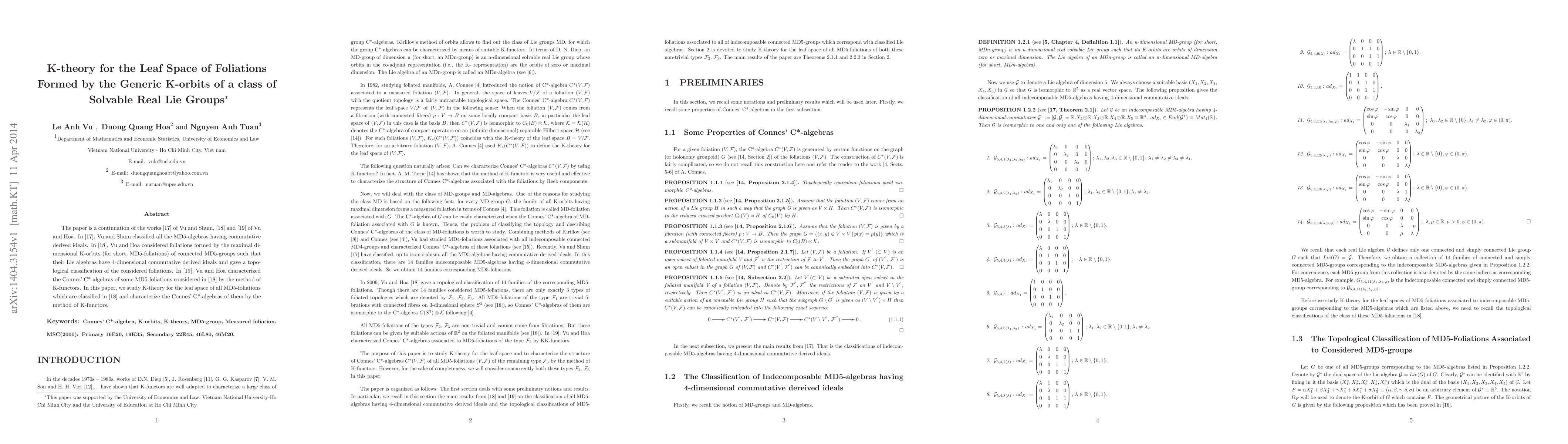 The paper is a continuation of the works [17] of Vu and Shum, [18] and [19] of Vu and Hoa. In [17], Vu and Shum classified all the MD5-algebras having commutative derived ideals. In [18], Vu and Hoa considered foliations formed by the maximal dimensional K-orbits (for short, MD5-foliations) of connected MD5-groups such that their Lie algebras have 4-dimensional commutative derived ideals and gave a topological classification of the considered foliations. In [19], Vu and Hoa characterized the Connes' C*-algebras of some MD5-foliations considered in \cite{VU-HO09} by the method of K-functors. In this paper, we study K-theory for the leaf space of all MD5-foliations which are classified in [18] and characterize the Connes' C*-algebras of them by the method of K-functors.