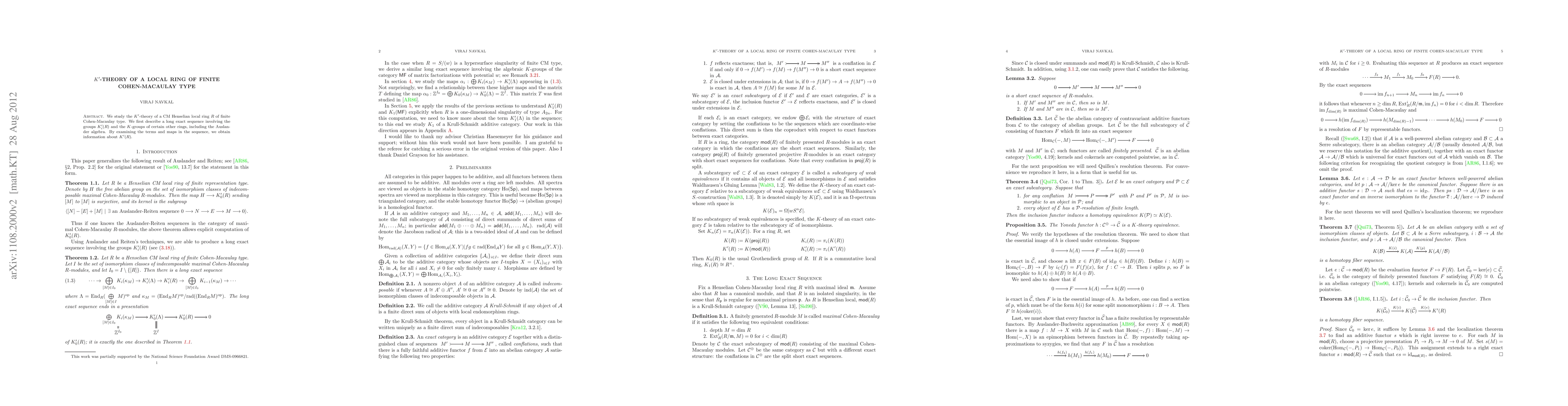 This research investigates the K'-theory of a specific type of local ring, namely a CM Henselian local ring of finite Cohen-Macaulay type. By constructing a long exact sequence involving K'_i(R) and K-groups of related rings, the authors derive insights into the structure of K'(R).