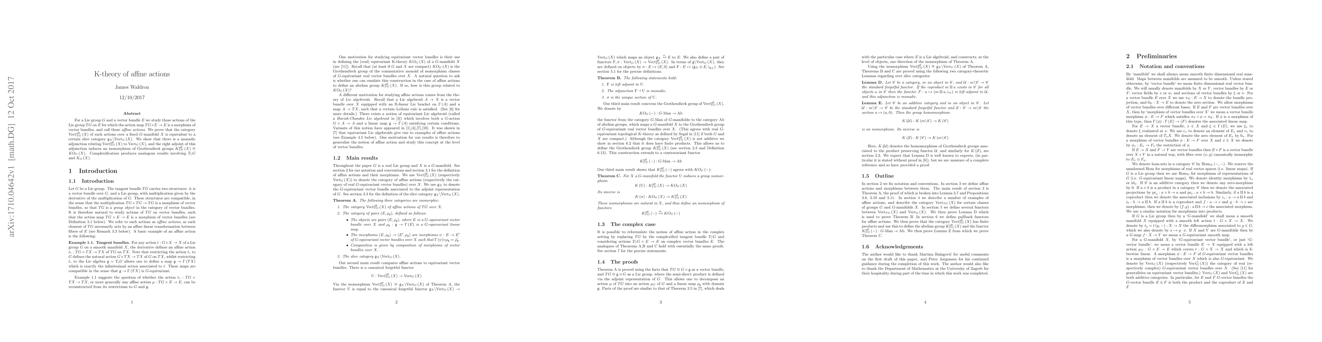 The paper studies affine actions of Lie groups on vector bundles and proves an equivalence between a slice category and a category of such actions, leading to a monadic adjunction and an isomorphism between Grothendieck groups.
