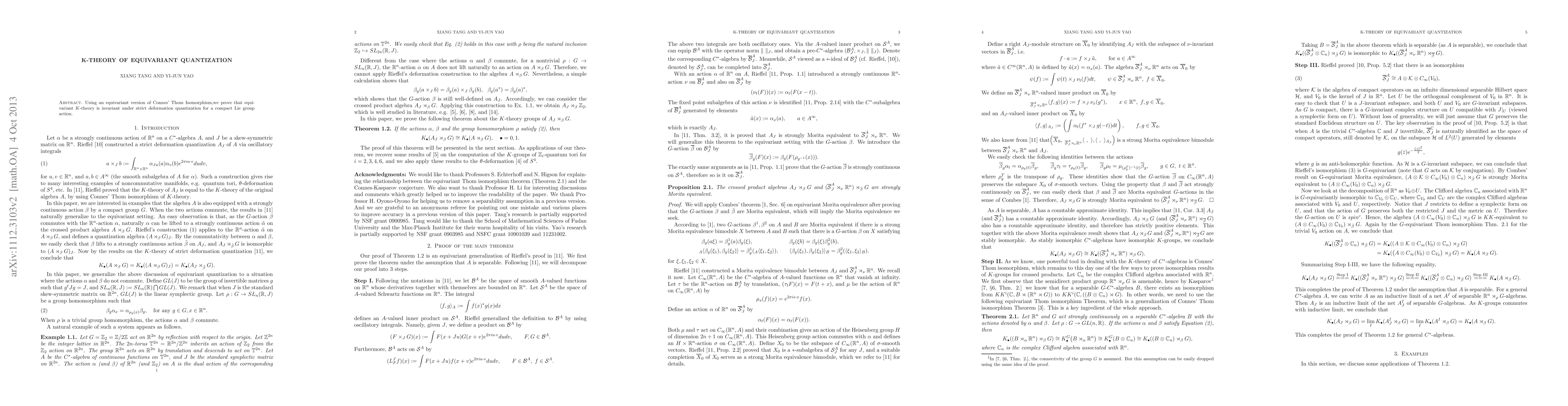 This paper demonstrates that equivariant $K$-theory remains unchanged under strict deformation quantization for a compact Lie group action, leveraging an equivariant version of Connes' Thom Isomorphism. The result shows invariance in the context of equivariant quantization.