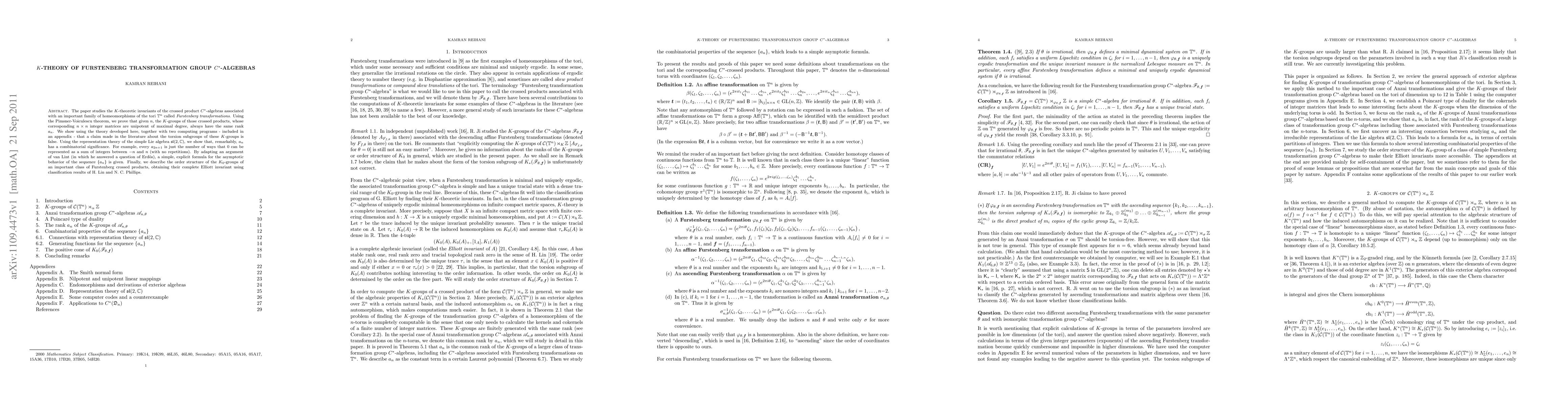 The paper studies the $K$-theoretic invariants of the crossed product $C^{*}$-algebras associated with an important family of homeomorphisms of the tori $\Bbb{T}^{n}$ called {\em Furstenberg transformations}. Using the Pimsner-Voiculescu theorem, we prove that given $n$, the $K$-groups of those crossed products, whose corresponding $n\times n$ integer matrices are unipotent of maximal degree, always have the same rank $a_{n}$. We show using the theory developed here, together with two computing programs - included in an appendix - that a claim made in the literature about the torsion subgroups of these $K$-groups is false. Using the representation theory of the simple Lie algebra $\frak{sl}(2,\Bbb{C})$, we show that, remarkably, $a_{n}$ has a combinatorial significance. For example, every $a_{2n+1}$ is just the number of ways that 0 can be represented as a sum of integers between $-n$ and $n$ (with no repetitions). By adapting an argument of van Lint (in which he answered a question of Erd\"os), a simple, explicit formula for the asymptotic behavior of the sequence $\{a_{n}\}$ is given. Finally, we describe the order structure of the K_{0}-groups of an important class of Furstenberg crossed products, obtaining their complete Elliott invariant using classification results of H. Lin and N. C. Phillips.