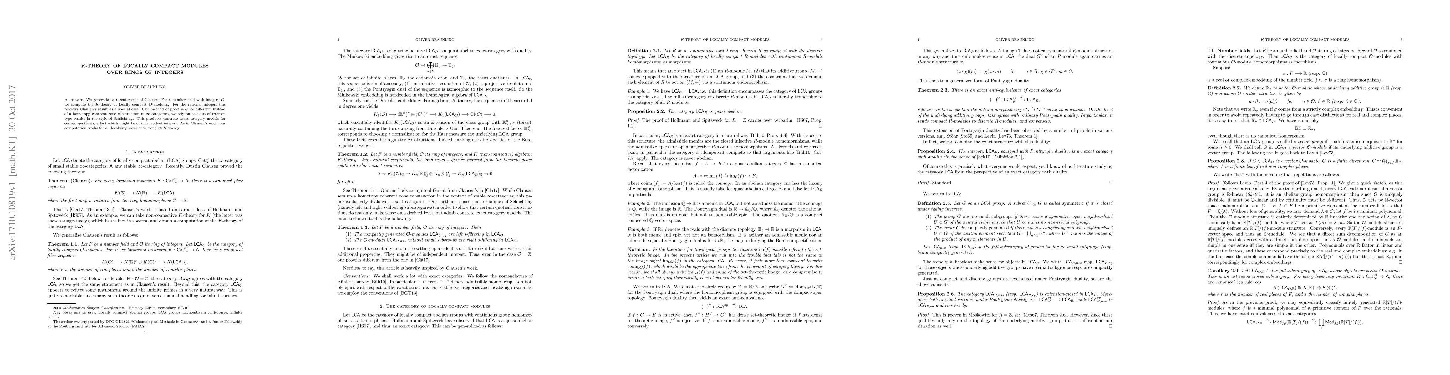 We generalize a recent result of Clausen: For a number field with integers O, we compute the K-theory of locally compact O-modules. For the rational integers this recovers Clausen's result as a special case. Our method of proof is quite different: Instead of a homotopy coherent cone construction in infinity categories, we rely on calculus of fraction type results in the style of Schlichting. This produces concrete exact category models for certain quotients, a fact which might be of independent interest. As in Clausen's work, our computation works for all localizing invariants, not just K-theory.