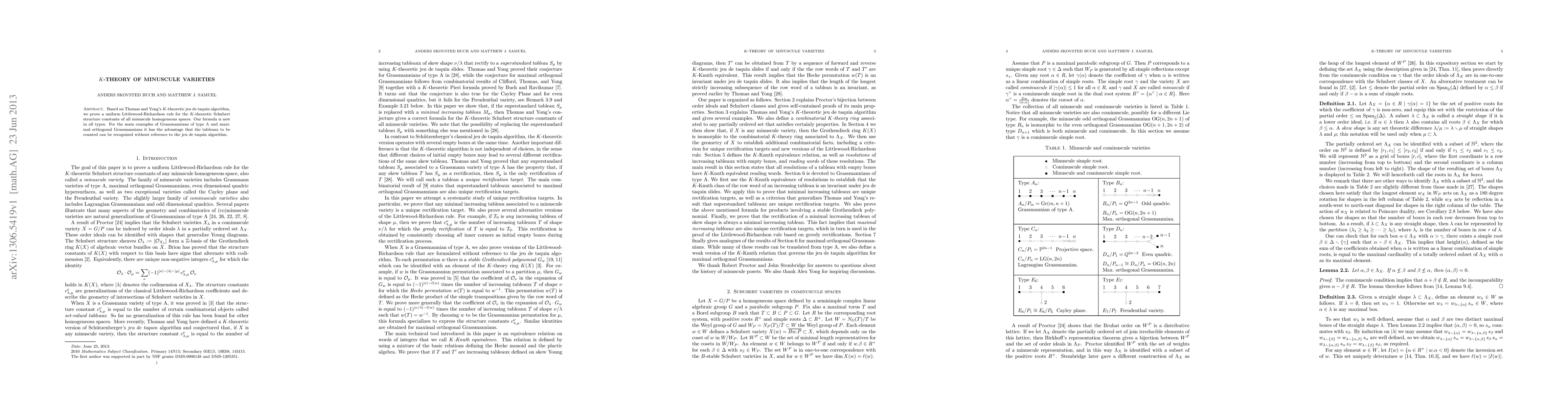 Based on Thomas and Yong's K-theoretic jeu de taquin algorithm, we prove a uniform Littlewood-Richardson rule for the K-theoretic Schubert structure constants of all minuscule homogeneous spaces. Our formula is new in all types. For the main examples of Grassmannians of type A and maximal orthogonal Grassmannians it has the advantage that the tableaux to be counted can be recognized without reference to the jeu de taquin algorithm.