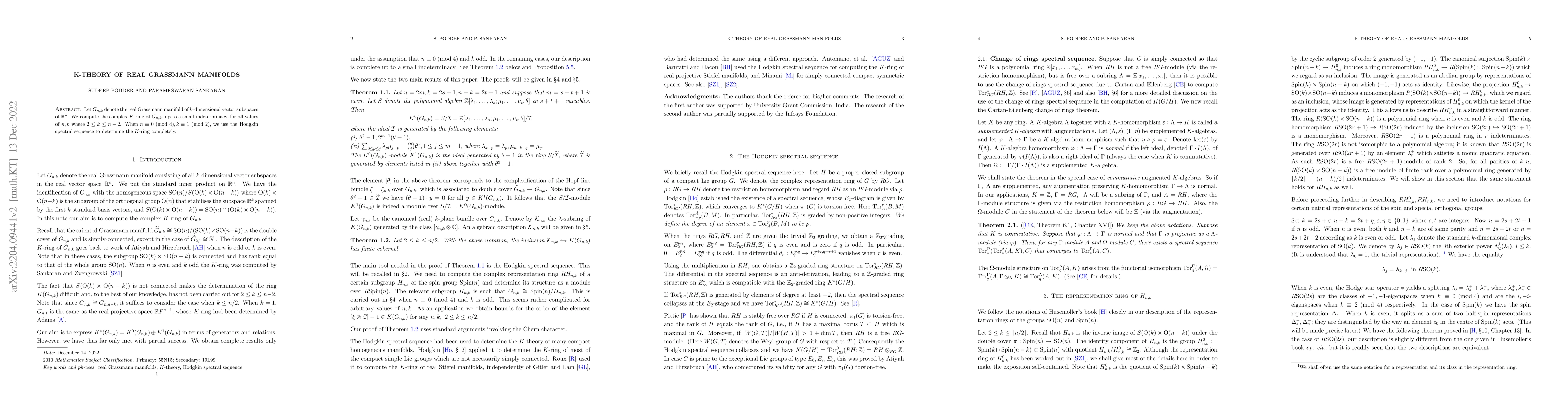 This paper computes the complex K-theory of real Grassmann manifolds $G_{n,k}$ using the Hodgkin spectral sequence, providing results up to small indeterminacy for $2\le k\le n-2$, with complete results when $n\equiv 0\!\!\mod 4$ and $k\equiv 1\!\!\mod 2$.