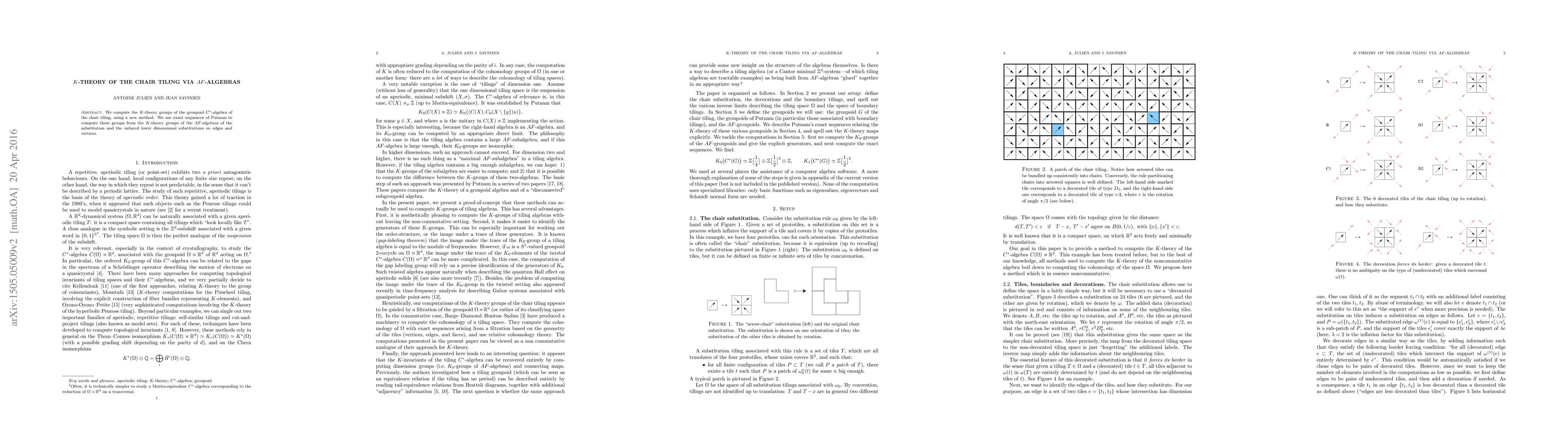 We compute the $K$-theory groups of the groupoid C$^\ast$-algebra of the chair tiling, using a new method. We use exact sequences of Putnam to compute these groups from the $K$-theory groups of the $AF$-algebras of the substitution and the induced lower dimensional substitutions on edges and vertices.