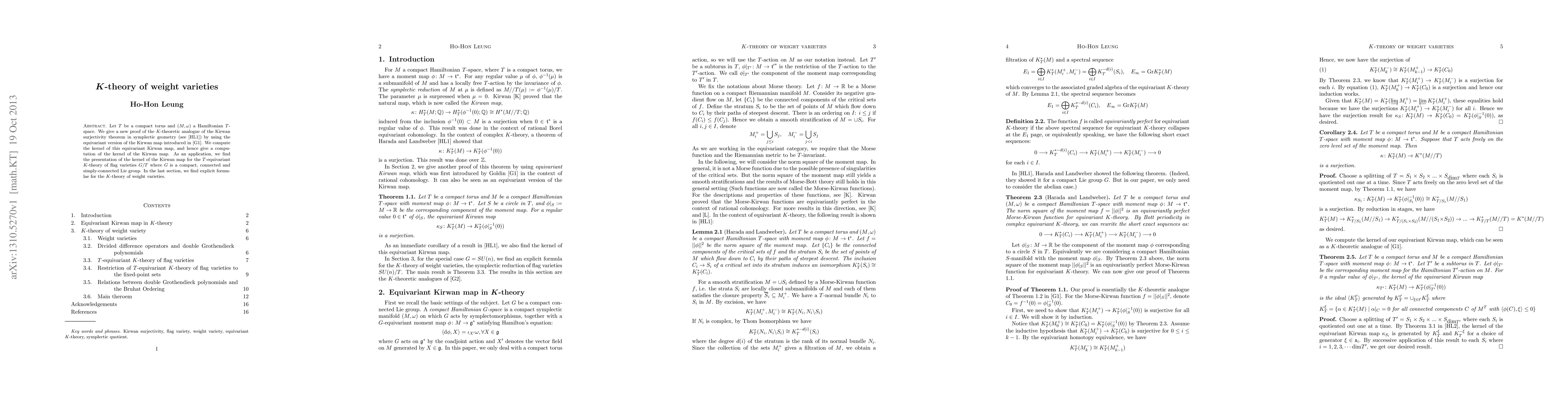 This paper presents a novel proof of a K-theoretic version of the Kirwan surjectivity theorem using an equivariant Kirwan map. It computes the kernel of this map and applies these findings to flag varieties, offering explicit formulae for the K-theory of weight varieties.