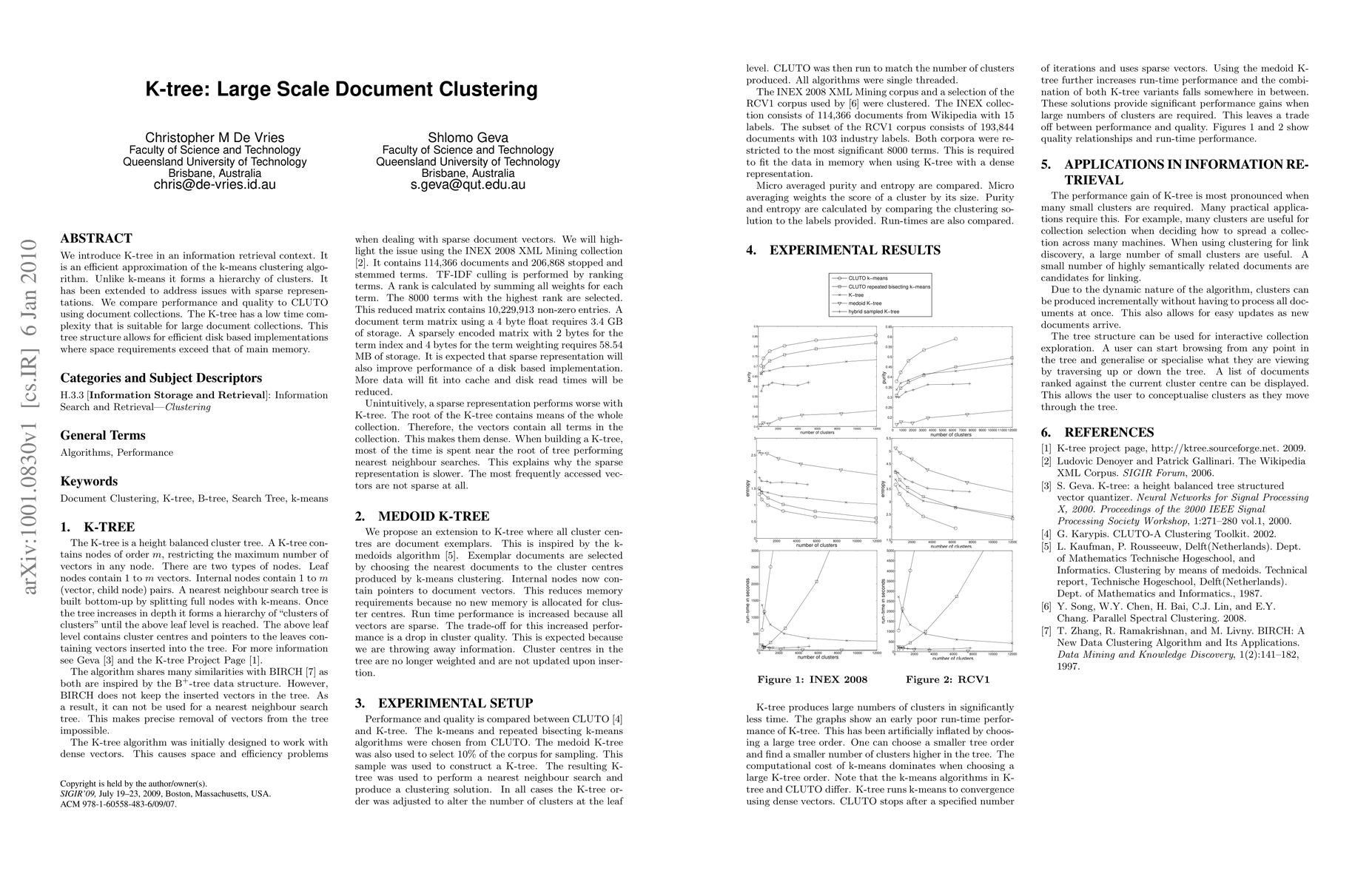 K-tree is an efficient clustering algorithm that approximates k-means and forms a hierarchical structure, suitable for large document collections with low time complexity. It outperforms CLUTO in performance and quality, especially in disk-based implementations for space-intensive data.