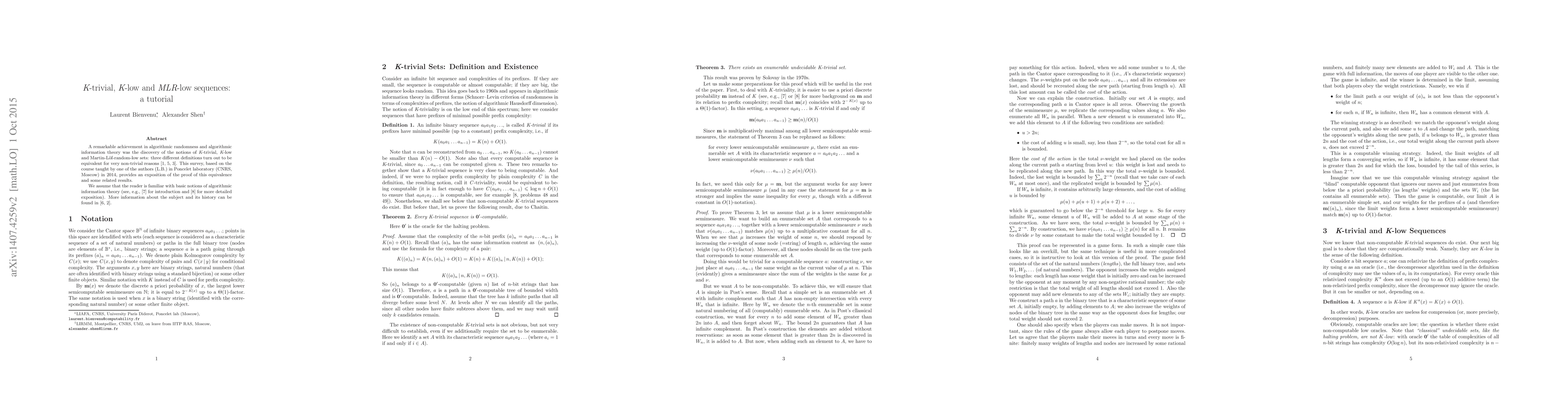This tutorial explains the equivalence of three distinct concepts in algorithmic randomness and information theory: K-trivial, K-low, and MLR-low sets. It assumes prior knowledge of basic algorithmic information theory notions and focuses on the proof of this equivalence.