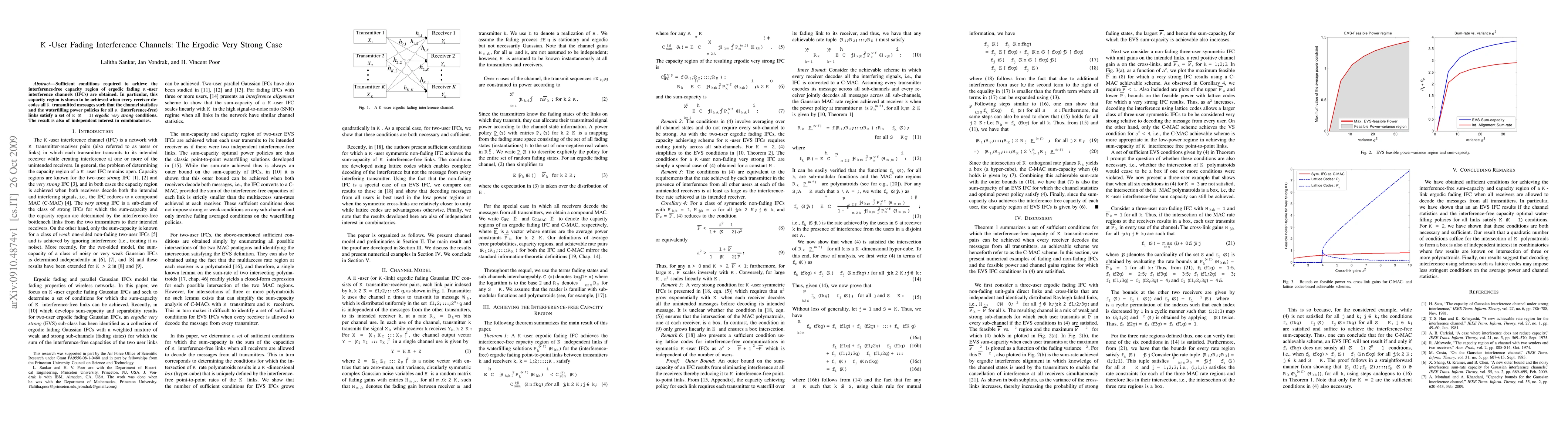 This paper establishes sufficient conditions for achieving the interference-free capacity region in ergodic fading K-user interference channels, demonstrating that it is possible under K(K-1) ergodic very strong conditions when each receiver decodes all K transmitted messages. The findings also contribute to combinatorial theory.