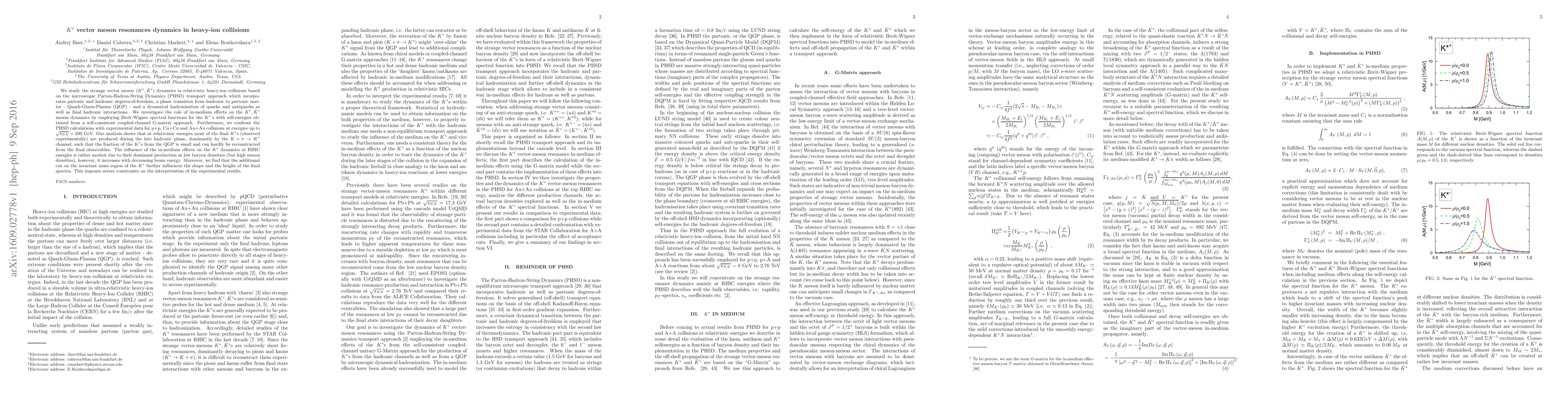 We study the strange vector meson ($K^*, \bar K^*$) dynamics in relativistic heavy-ion collisions based on the microscopic Parton-Hadron-String Dynamics (PHSD) transport approach which incorporates partonic and hadronic degrees-of-freedom, a phase transition from hadronic to partonic matter - Quark-Gluon-Plasma (QGP) - and a dynamical hadronization of quarks and antiquarks as well as final hadronic interactions. We investigate the role of in-medium effects on the $K^*, \bar K^*$ meson dynamics by employing Breit-Wigner spectral functions for the $K^*$'s with self-energies obtained from a self-consistent coupled-channel G-matrix approach. Furthermore, we confront the PHSD calculations with experimental data for p+p, Cu+Cu and Au+Au collisions at energies up to $\sqrt{{s}_{NN}} = 200$~GeV. Our analysis shows that at relativistic energies most of the final $K^*$s (observed experimentally) are produced during the late hadronic phase, dominantly by the $K+ \pi \to K^*$ channel, such that the fraction of the $K^*$s from the QGP is small and can hardly be reconstructed from the final observables. The influence of the in-medium effects on the $K^*$ dynamics at RHIC energies is rather modest due to their dominant production at low baryon densities (but high meson densities), however, it increases with decreasing beam energy. Moreover, we find that the additional cut on the invariant mass region of the $K^*$ further influences the shape and the height of the final spectra. This imposes severe constraints on the interpretation of the experimental results.